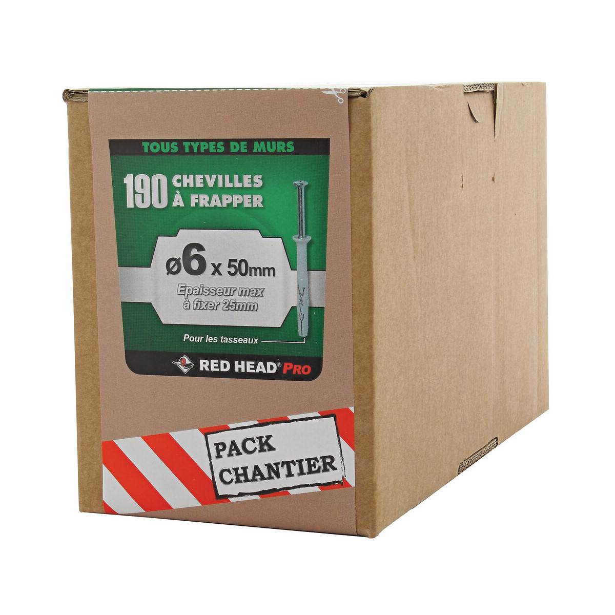Boîte de 190 Frapex M 6x50mm.La cheville Frapex M est la seule cheville frapper fonctionnant dans tous les matériaux supports : pleins, creux, y compris plaque de plâtre pour les petites dimensions. Elle se choisit en fonction de l'épaisseur à fixer désignée par sa partie lisse sous la collerette. Idéale pour les travaux répétitifs. Il suffit de la frapper au marteau pour déclencher l'expansion. A utiliser pour la pose des tasseaux, porte-manteau, pièces de bois, plinthes. Elle se choisit en fonction de l'épaisseur à fixer désignée par sa partie lisse sous la collerette. Idéale pour les travaux répétitifs. Il suffit de la frapper au marteau pour déclencher l'expansion.Spécifications techniques