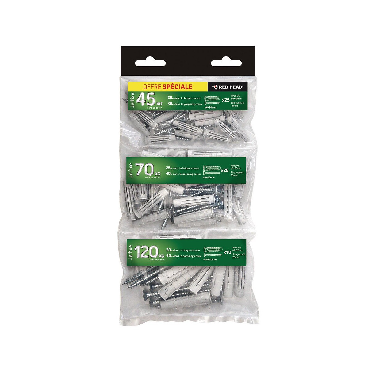 Sachet de 60 chevilles NORDTECH : 6x30mm + vis 4x40mm + 8x40mm + vis 5x50mm 10x50mm + vis 6x70mm. Fonctionne dans tous les types de murs : pleins, creux, ou plaque de plâtre.Spécifications techniques