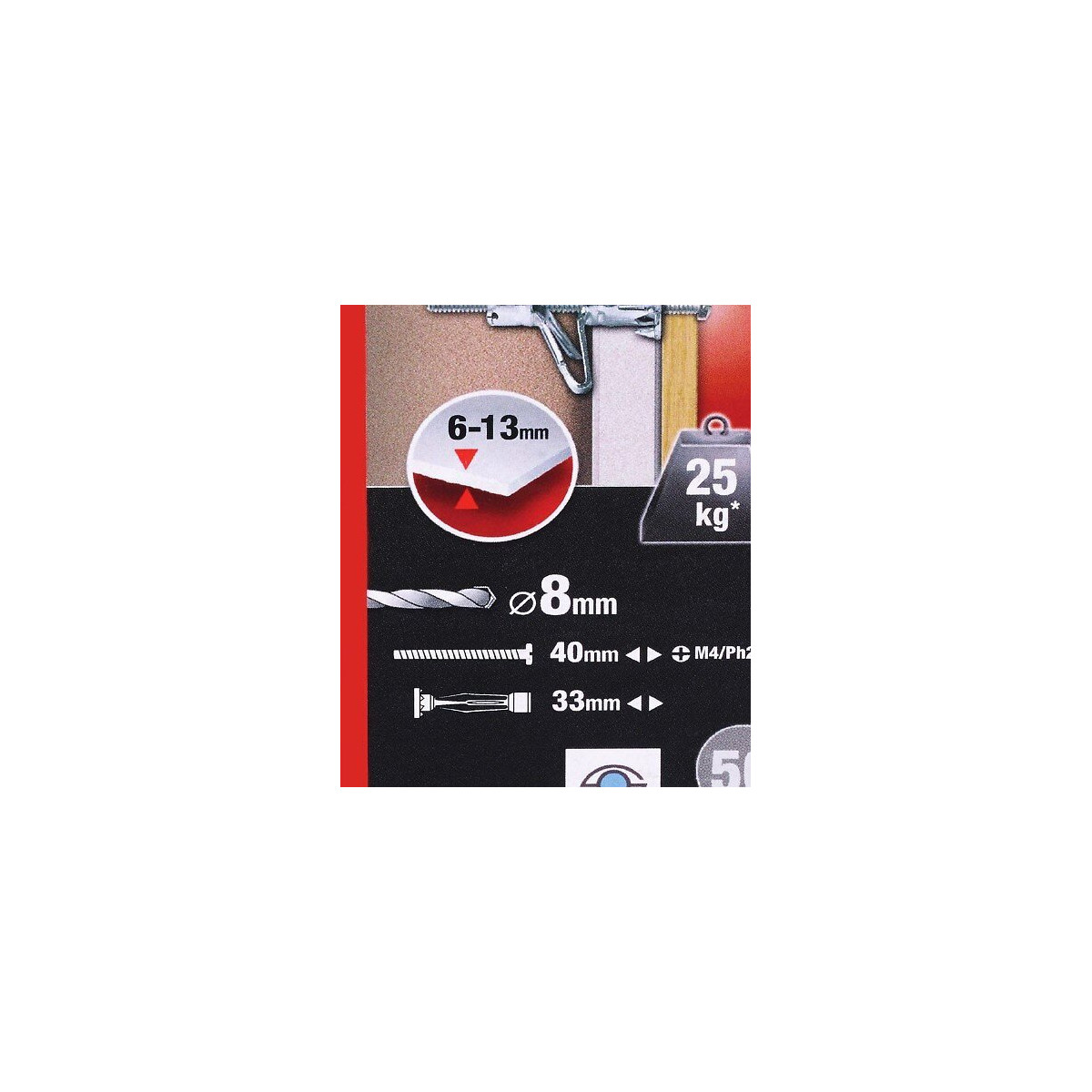 50 chevilles métal à expension. Dimensions:ension. Dimensions: Ø 4 x 33 mm avec vis M4. Fabrication monobloc traitée anti-corrosion. Cohésion parfaite des 3 parties. Possède un système d'ancrage « en parapluie » pour une meilleure résistance. Tête détachable. Disparition dans la cloison.