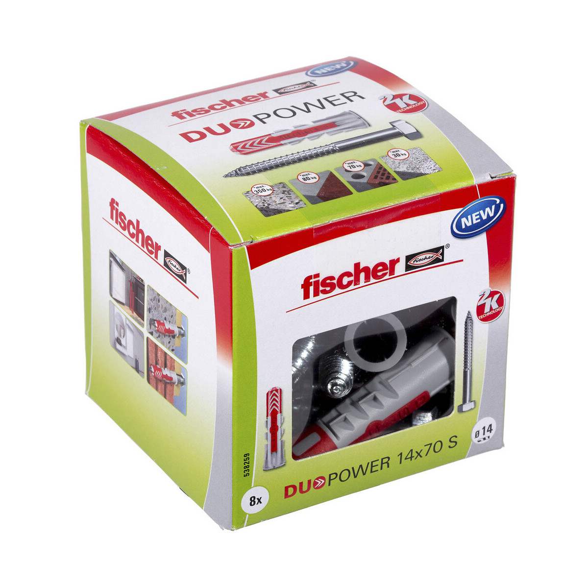 Cheville DUOPOWER tous matériaux. Offre une grande résistance grâce à ses 2 composants : composant gris nylon haute qualité active qui automatiquement le mode de fonctionnement optimal en fonction du matériau de construction pour une tenue optimale : et ailettes d'expansion du composant rouge favorisant une expansion sûre et sécuritaire. Vissage facile sans rotation de la vis. Collerette évitant le glissement de la cheville dans le forage. Ergots anti-rotation. Dimensions 14x70mm.Spécifications techniques