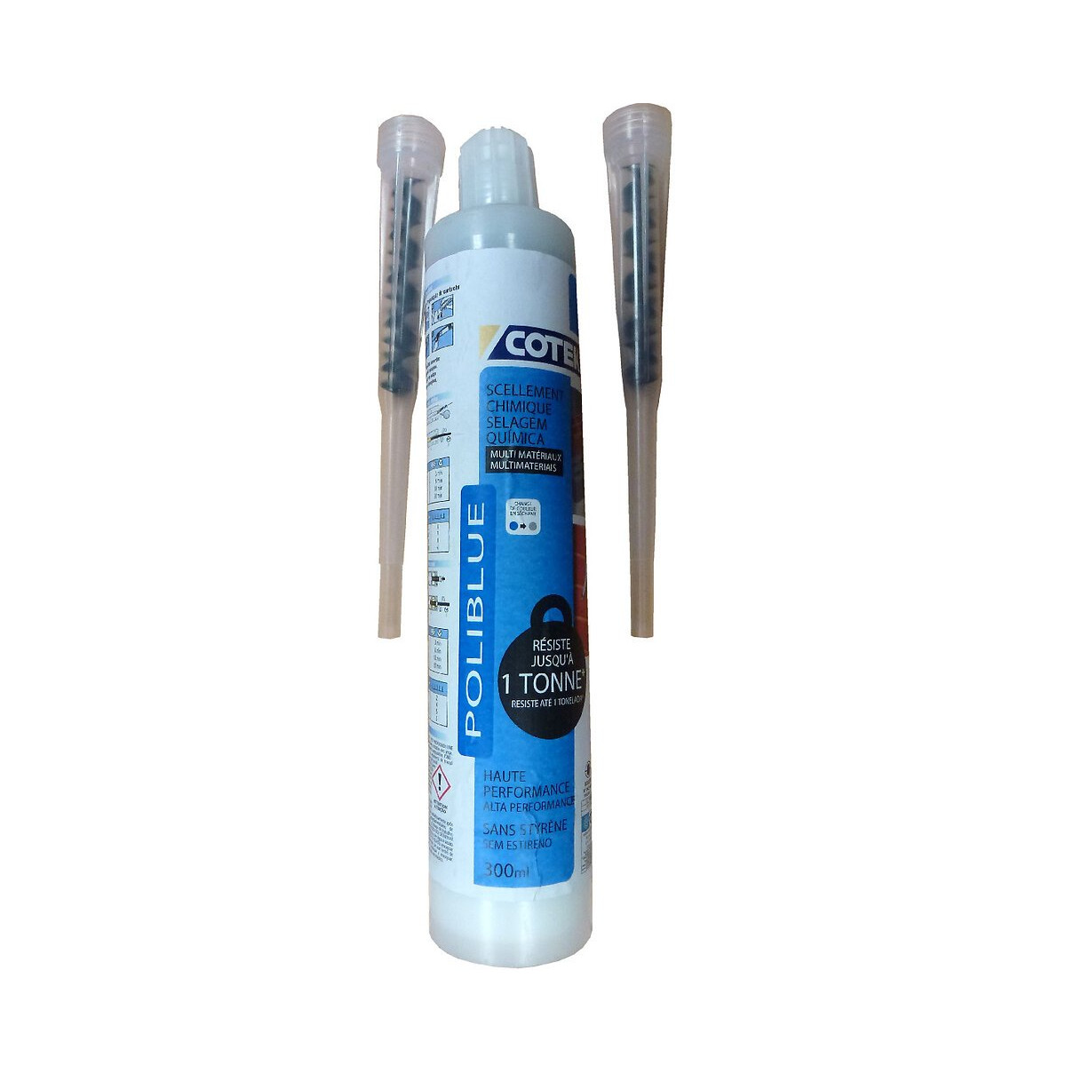 Cartouche de scellement chimique sans styrène 300ml avec témoin de pose bleu + 2 canules Usage du produit : Pose de charge lourdes sur matériaux pleins et creux, tous type de murs. S'utilise avec un pistolet.