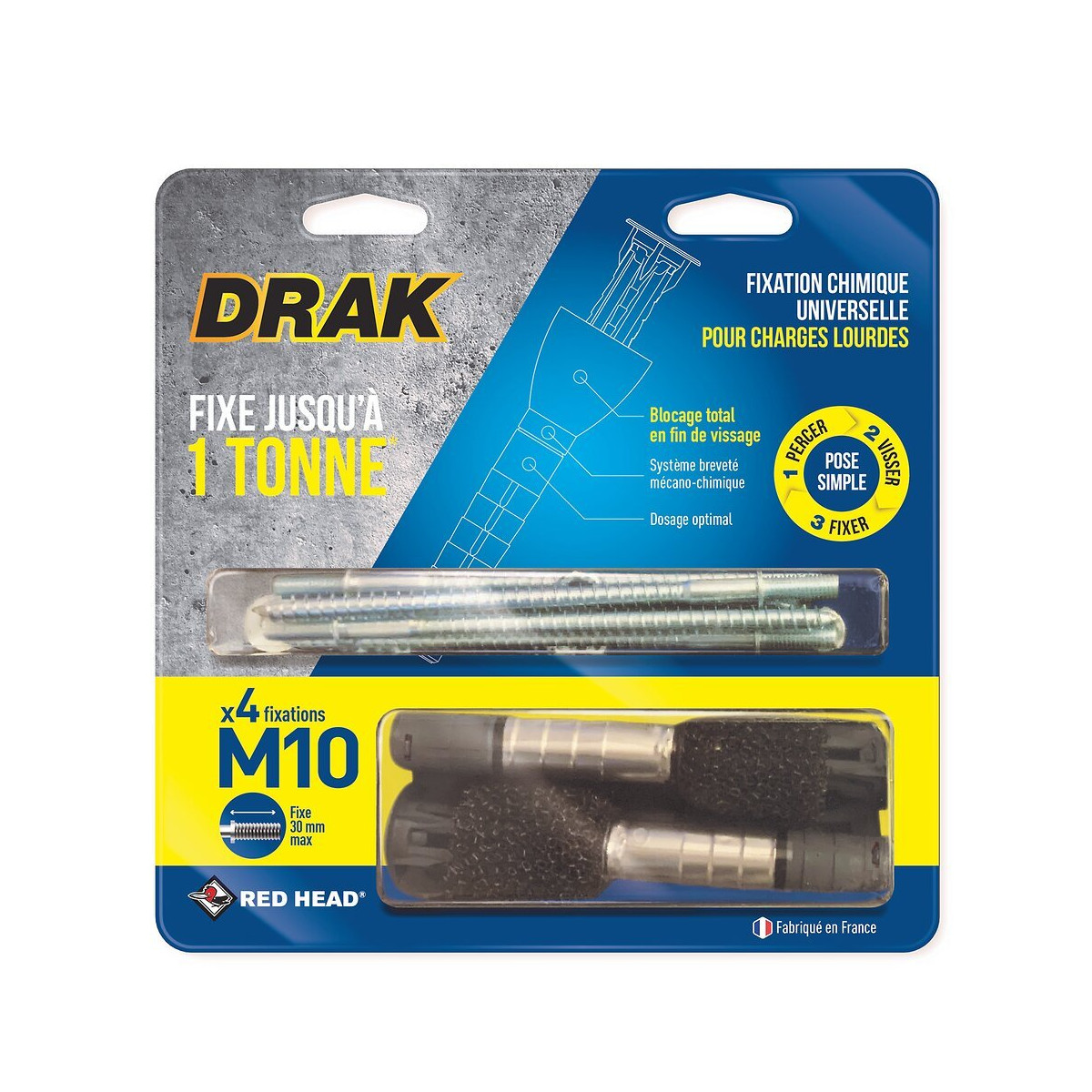 DRAK + tiges filetée M10+ rondelles + écrous + embout Torx. Pose facile en 3 étapes (percer, visser, fixer) ne nécessitant pas de pistolet ni de cartouche et ne générant pas de déchet d'emballages.Spécifications techniques