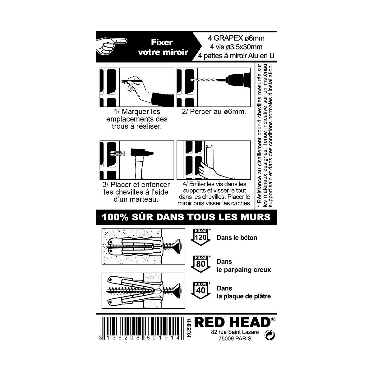 Solution complète pour réaliser la fixation de votre objet Type de mur: Tout type de mur Composition du kit: 4chevilles Grapex 6mm, 4 vis 3,5x30mm et 4 pattes miroir aluminium en U Matière du support: Métal ou bois Marque du produit: RED HEAD Matière principale: Polypropylène Usage du produit: Patte miroir aluminium en U Longueur (en mm): 25 Diamètre de la cheville (en mm): 4 - 5 - 6 mm Diamètre (en mm): 6 Perçage préalable: Oui Type d'outil à utiliser: Tournevis ou visseuse Produit emballé : hauteur (en cm): 18.3 Produit emballé : largeur (en cm): 7.9 Produit emballé : profondeur (en cm): 1.7 Produit emballé : poids (en kg): 0.044 Indication du geste de tri (triman): Nos produits et emballages peuvent faire l'objet d'une consigne de tri. Pour en savoir plus : www.quefairedemesdechets.frSpécifications techniques