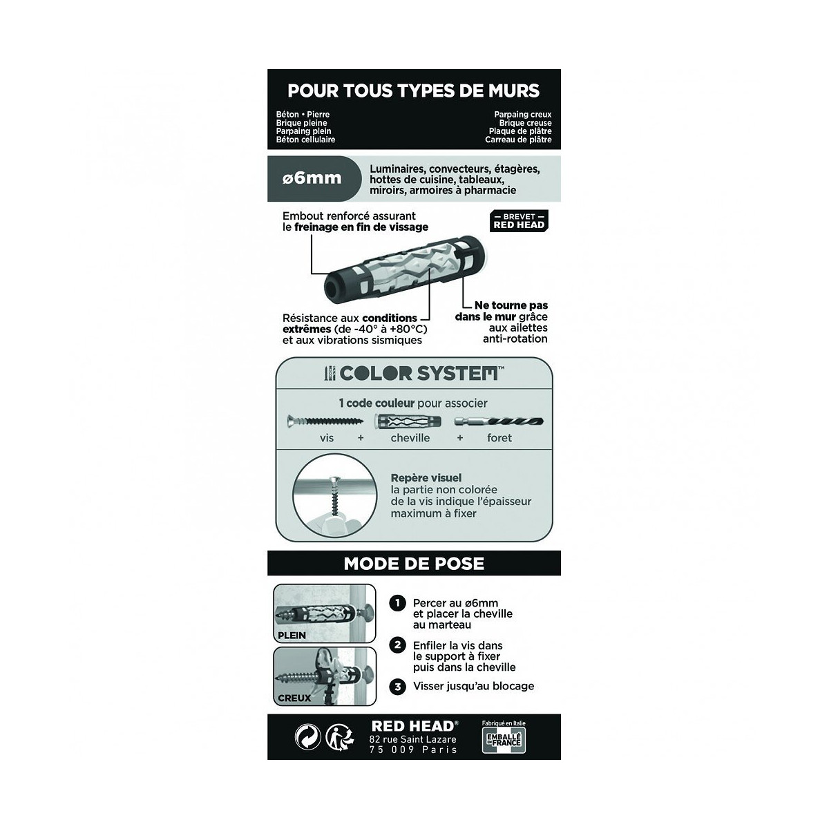 Marque du produit: RED HEAD Type de mur: Tout type de mur Longueur de la cheville (en mm): Moins de 50 Diamètre de la cheville (en mm): 6 Poids indicatif supporté matériau creux (en kg): 20 Poids indicatif supporté matériau plein (en kg): 60 Nombre de chevilles: Moins de 10 Type d'outil à utiliser: Tournevis ou visseuse Perçage préalable: Oui Lot: Lot de 8 Indication du geste de tri (triman): Nos produits et emballages peuvent faire l'objet d'une consigne de tri. Pour en savoir plus : www.quefairedemesdechets.frSpécifications techniques