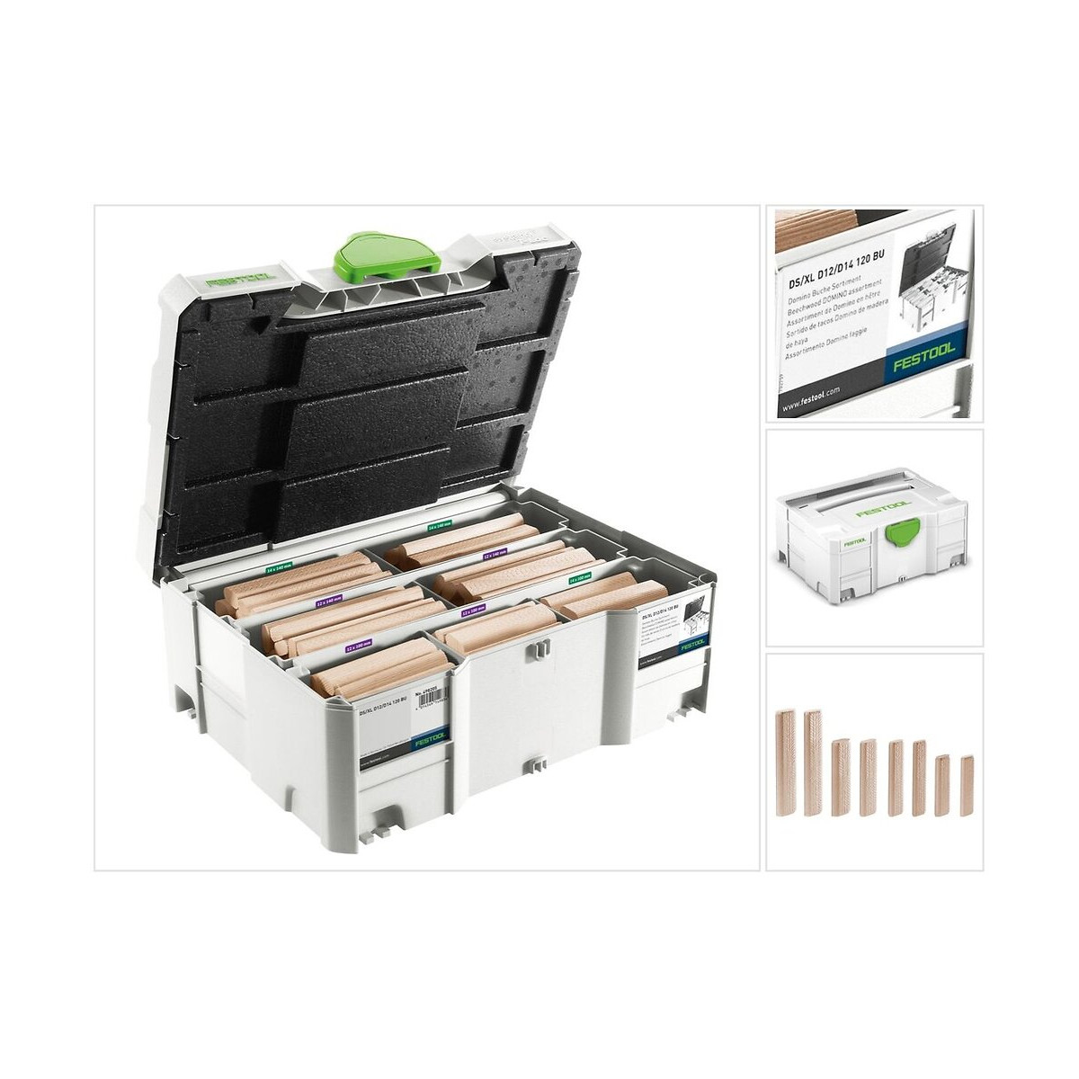 Contenu du paquet: - 1x Festool Domino XL DS/XL D12/D14 Chevilles en hêtre 128 pcs. BU ( 498205 ) - En coffret SYSTAINER SYS 2 T-LOC Description du produit: Les 128 chevilles en hêtre DOMINO XL DS/XL D12/D14 possèdent une stabilités optimale et un robustesse extrême grâce a leur formes particulière, en combinaison aux alvéoles pour colle et rainures latérales. Les chevilles comportes de différentes tailles de 4x20 mm à 14x140 mm. Spécifications techniques: Assortiment de chevilles DOMINO XL en hêtre DOMINO 12x100, 12x140, 14x100, 14x140 mm et fraise DOMINO XL pour taille 14