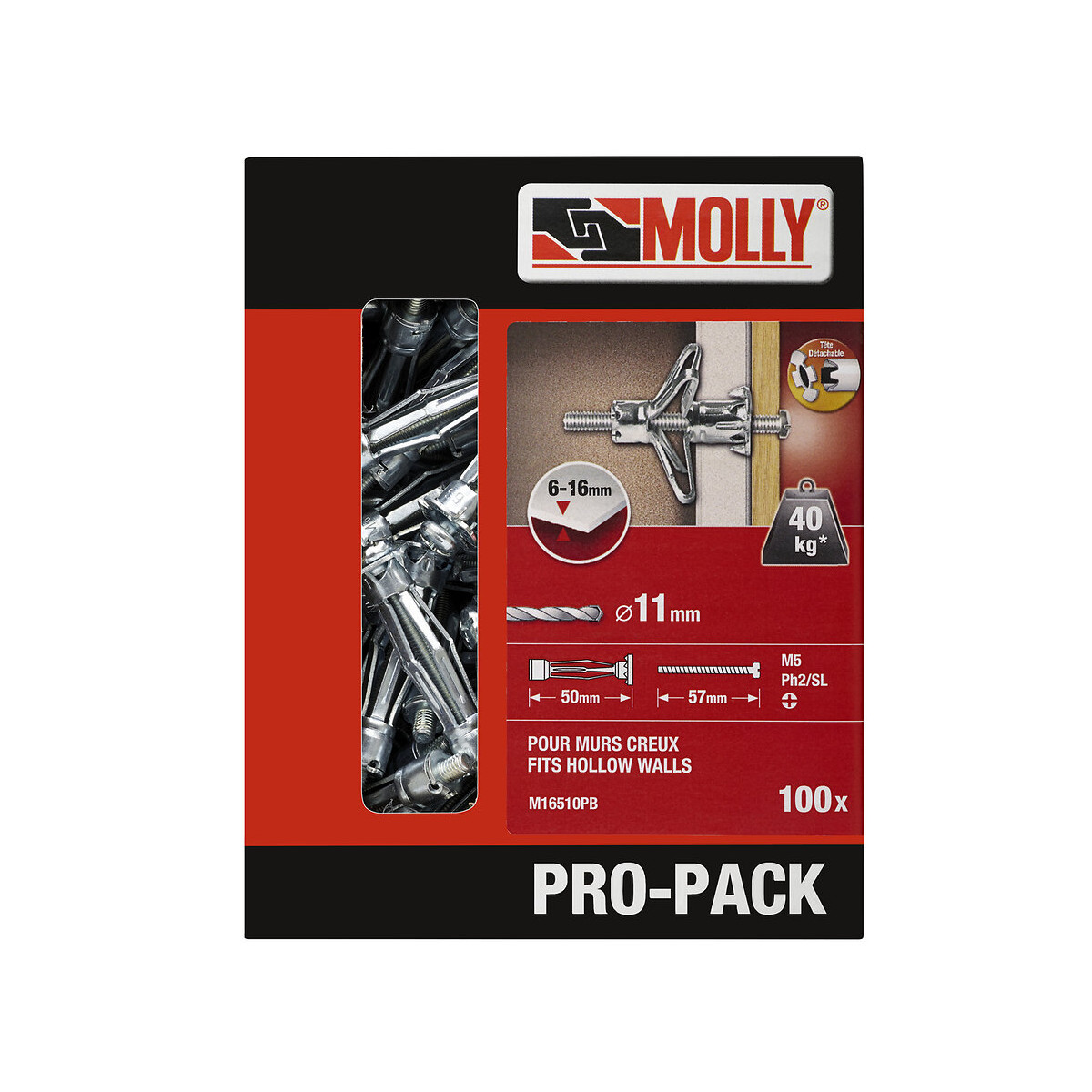 100 chevilles métal à expension. Dimensions: Ø 5 x 50 mm avec vis M5 Fabrication monobloc traitée anti-corrosion. Cohésion parfaite des 3 parties. Possède un système d'ancrage « en parapluie » pour une meilleure résistance. Tête détachable. Disparition dans la cloison.