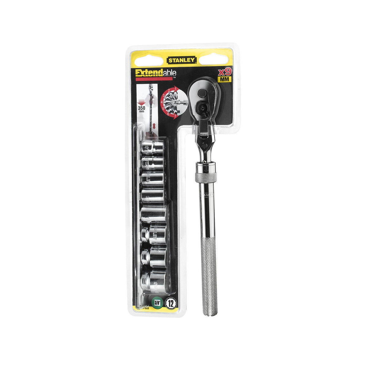 Tête articulée 180° : 7 positions Système Quick Release pour un dégagement rapide des douilles Jeu de 9 pièces : Cliquet 3/8” extensible + 8 Douilles MicroTough