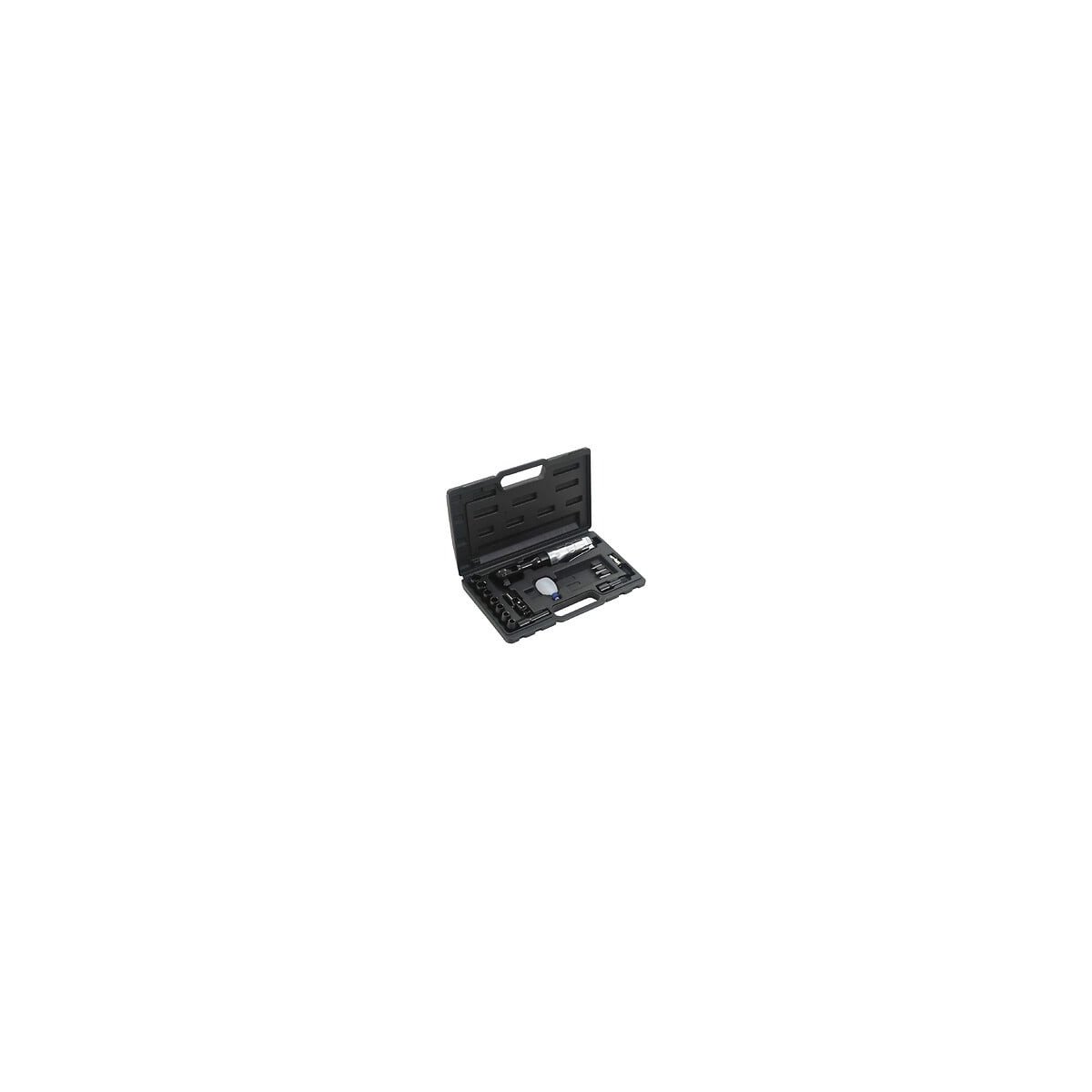 Ce kit contient 1 clé à cliquet pneumatique, 7 douilles de différentes tailles, 1 barre d'extension, 1 mamelon, 1 joint universel, 1 réservoir d'huile, 1 porte-embouts, et 3 embouts. Cet ensemble d'outils est indispensable pour les garages et les ateliers. La clé à cliquet est équipée d'un échappement d'air avant et sa rotation peut être réglée (dans le sens des aiguilles d'une montre ou dans le sens inverse) à l'aide de l'interrupteur avant/arrière de la tête de cliquet. Toutes les pièces sont livrées dans une mallette pratique moulée par soufflage. Matériau : Aluminium et plastique Dimensions de la mallette : 35 x 21 cm (l x P) Longueur de la clé à cliquet : 27 cm Taille de la douille : 1/2" Vitesse sans charge : 150 tr /min Couple maximal : 61 Nm Consommation d'air : 5 CFM Pression maximale de fonctionnement : 6,3 bar Interrupteur avant / arrière Échappement d'air avant La livraison comprend : 1 x clé à cliquet pneumatique 7 x douille (9 mm, 10 mm, 11 mm, 13 mm, 14 mm, 17 mm et 19 mm) 1 x barre d'extension (75 mm) 1 x Joint universel 1 x réservoir d'huile 1 x embout 1 x porte-embout 1 x embout à fente (5,5 mm) 2 x embout Philips (PH2 et PH3) Toutes les pièces sont livrées dans une mallette pratique moulée par soufflageSpécifications techniques