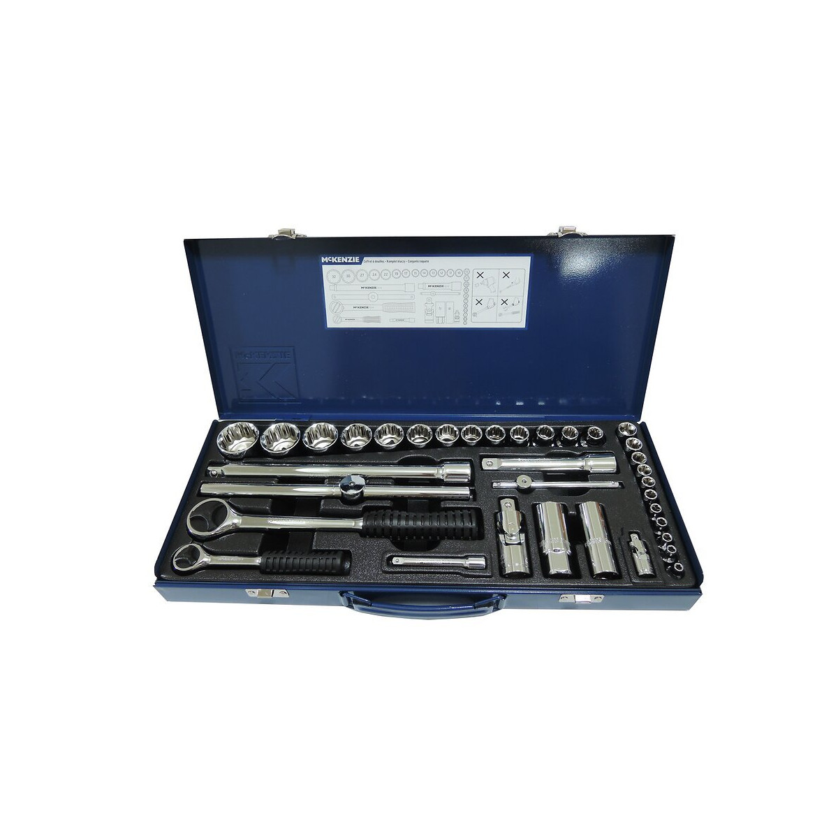 Cet ensemble complet d'accessoires sera un ajout pratique à votre panoplie d'outils. Composé entre autre de douilles, de barres de rallonge ou encore de prises de bougie, cet ensemble vous garantira une polyvalence optimale dans tous vos travaux. Ils vont permettront d'effectuer le serrage et desserrage d'éléments tels que des vis, des écrous ou des boulons, efficacement et en toute facilité. Les différentes tailles disponibles dans cet ensemble vous permettront de couvrir tous les besoins que vous rencontrerez dans vos travaux. La confection robuste de ces accessoires vous permettra d'obtenir un résultat optimal dans vos travaux. Avec leur géométrie précise, ils se mettent en place très facilement et se fixent durablement sans risque de se déloger. La manipulation de ces accessoires se fait sans aucune difficulté grâce à leur conception ergonomique. La qualité de leur composition leur assure une grande durabilité et résistance pour vous garantir une utilisation précise et sécurisée dans tous vos travaux. Nombre de pièces : 35 Matériel : chrome-vanadium Finition : miroir Contenu : 1/4'' 11 douille : 4-4.5-5-5.5-6-7-8-9-10-11-13mm 1 universelle commune 1 barre de rallonge 75mm 1 barre coulissante 1 manche à cliquet 1-45t 1/2'' 13 douille : 10-11-12-13-14-15-17-19-22-24-27-30-32mm 2 prises de bougie 16 et 21 mm 2 barre de rallonge 125 & 250 mm 1 universelle jointe 1 barre coulissante 1 manche à cliquet 1-45t