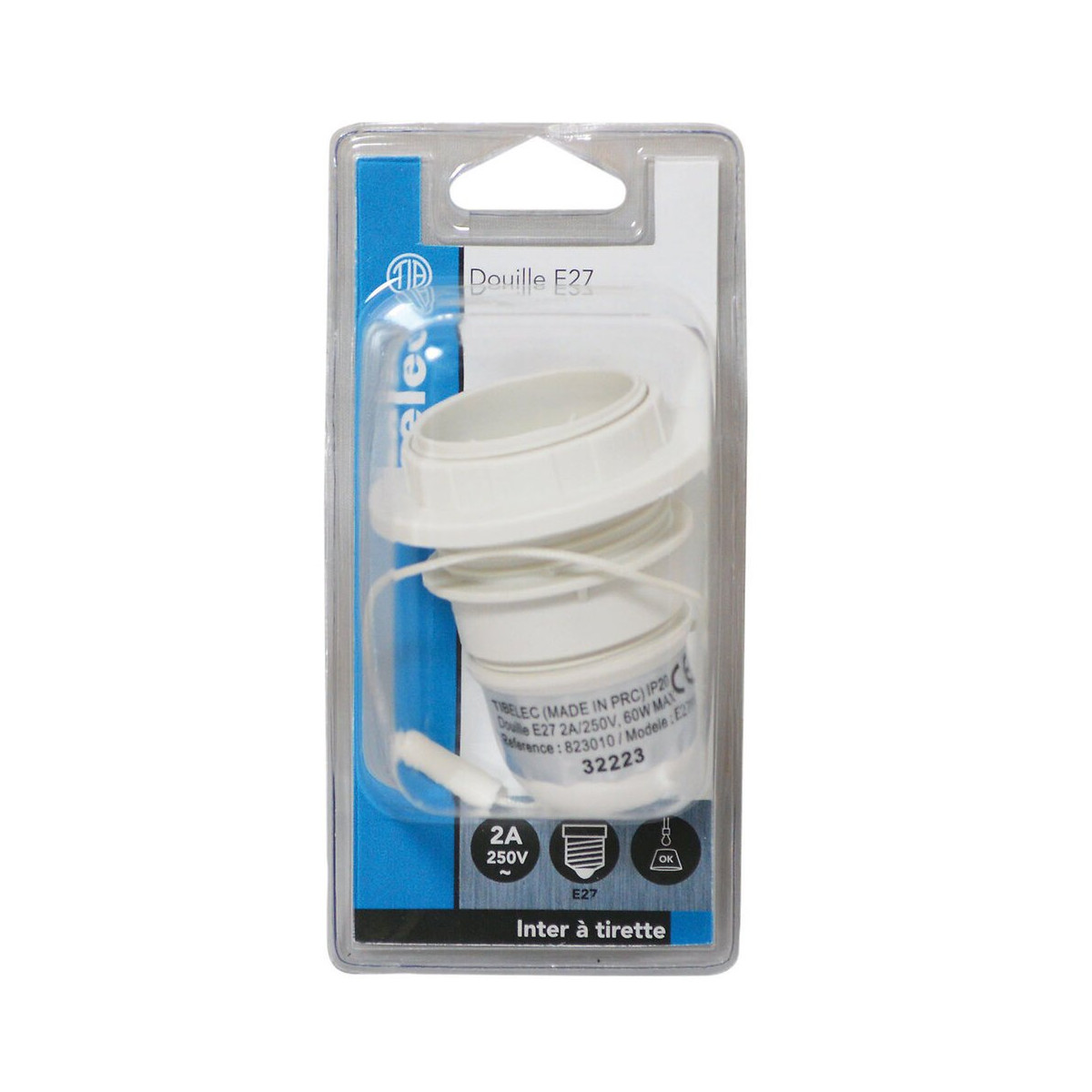 Douille E27 demi-filetée avec interrupteur à tirette. S'installe sur un luminaire avec abat-jour pour l'équiper d'une ampoule à culot E27 et d'un interrupteur. 2A 250V - 60W maxi. Femelle pas 10x1. Bague de fixation pour abat-jour. Vis de blocage anti-rotation. Tirette longueur 16cm. 46x66mm. Coloris blanc.