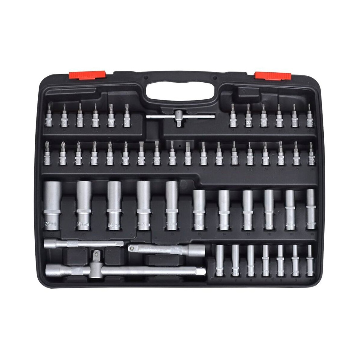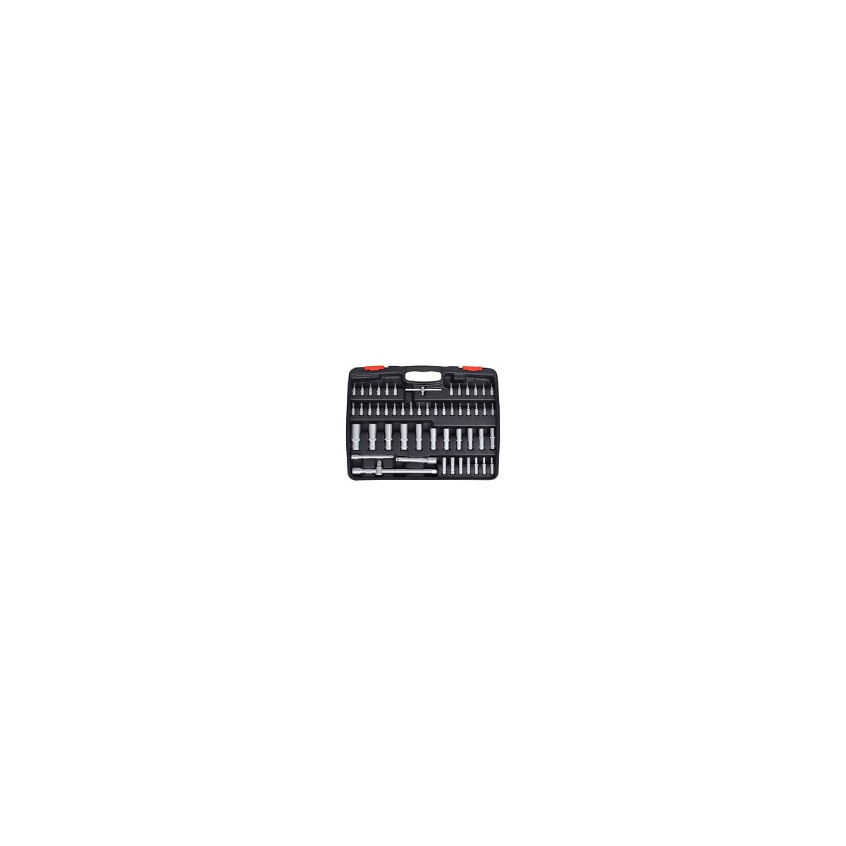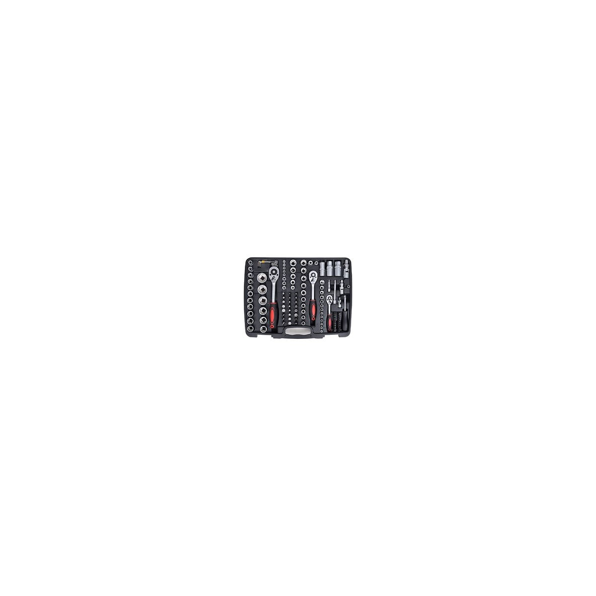 Ce coffret, composé de 193 douilles de différentes tailles et d'un cliquet, est essentiel pour une utilisation quotidienne et de longue durée dans les garages, ateliers ou jardin. C'est un kit parfait pour tous les amateurs de bricolage et de mécanique. Le cliquet réversible est idéal pour serrer et desserrer les boulons dans les zones difficiles à atteindre. Le bouton-poussoir de découplage rapide permet un changement rapide des douilles. Le levier à l'arrière de la tête permet de changer le sens de rotation rapidement et efficacement. La poignée revêtue de caoutchouc souple assure une prise confortable lors de l'utilisation. L'acier au chrome vanadium traité thermiquement apporte à ce set puissance et durabilité pour une fiabilité à long terme. Toutes les douilles sont estampillées avec leur taille. Avec toutes les pièces parfaitement stockées et triées dans une mallette, il est facile à transporter. Matériau : acier au chrome vanadium robuste Matériaux du manche du cliquet : PP + TPR Dimension de la mallette : 44 x 34 x 9 cm (L x P x H) 1/4" : 1 cliquet 13 douilles : 4 / 4,5 / 5 / 5,5 / 6 / 7 / 8 / 9 / 10 / 11 / 12 / 13 / 14 mm 7 douilles profondes : 6 / 7 / 8 / 9 / 10 / 11 / 12 / 13 mm 5 douilles Torx : E4 / E5 / E6 / E7 / E8 2 barres d'extension : 50 / 100 mm 1 barre en T coulissante 1 rotule universelle 1 coupleur 1 tournevis avec embout pour douille 3 embouts plats : 4 / 5,5 / 7 mm 6 embouts phillips : PH1 / PH2 / PH3 / PZ1 / PZ2 / PZ3 5 embouts Allen : 2 / 3 / 4 / 5 / 6 mm 8 embouts Torx : T8 / T9 / T10 / T15 / T20 / T25 / T27 / T30 8 embouts Torx creux : T8 / T9 / T10 / T15 / T20 / T25 / T27 / T30 3/8" : 1 cliquet 10 douilles : 10 / 11 / 12 / 13 / 14 / 15 / 16 / 17 / 18 / 19 mm 6 douilles profondes : 10 / 11 / 12 / 13 / 14 / 15 mm 6 douilles Torx : E10 / E11 / E12 / E14 / E16 / E18 1 barre d'extension : 125 mm 1 coupleur 1 rotule universelle 1 clé à bougie 18 mm 1/2" : 1 cliquet 17 douilles : 10 / 11 / 12 / 13 / 14 / 15 / 16 / 17 / 18 / 19 / 20 / 21 / 22 / 24 / 27 / 30 / 32 mm 5 douilles profondes : 16 / 17 / 18 / 19 / 22 mm 2 douilles Torx : E20 / E24 2 barres d'extension : 125 / 250 mm 1 adaptateur 3 voies 1 rotule universelle 1 coupleur 2 douilles à bougie : 16 / 21 mm 7 clés Allen : 1,27 / 1,5 / 2 / 2,5 / 3 / 4 / 5 mm Embouts : 3 embouts plats 5/16" : 8 / 10 / 12 mm 4 embouts phillips 5/16" : PH3 / PH4 / PZ3 / PZ4 6 embouts Torx 5/16" : T40 / T45 / T50 / T55 / T60 / T70 6 embouts Torx creux 5/16" : T40 / T45 / T50 / T55 / T60 / T70 5 embouts Allen 5/16" : 7 / 8 / 10 / 12 / 14 mm 4 embouts phillips 1/4" : PH1 / PH2 / PZ1 / PZ2 8 embouts Torx 1/4" : T5 / T6 / T7 / T10 / T15 / T20 / T25 / T27 8 embouts reux Torx 1/4" : T7 / T10 / T15 / T20 / T25 / T27 / T30 / T40 14 embouts 1/4" : VH2 / VH2,5 / V5 / VMP5 / VT20 / VT30 / MP6 / MP7 / V6 / VT40 / VTS45 / VMP9 / V8 / MP8 7 embouts creux 1/4" : VTS10 / VTS15 / VTS20 / VTS25 / VTS27 / VTS30 / VTS40 Avec une mallette pour un rangement facile