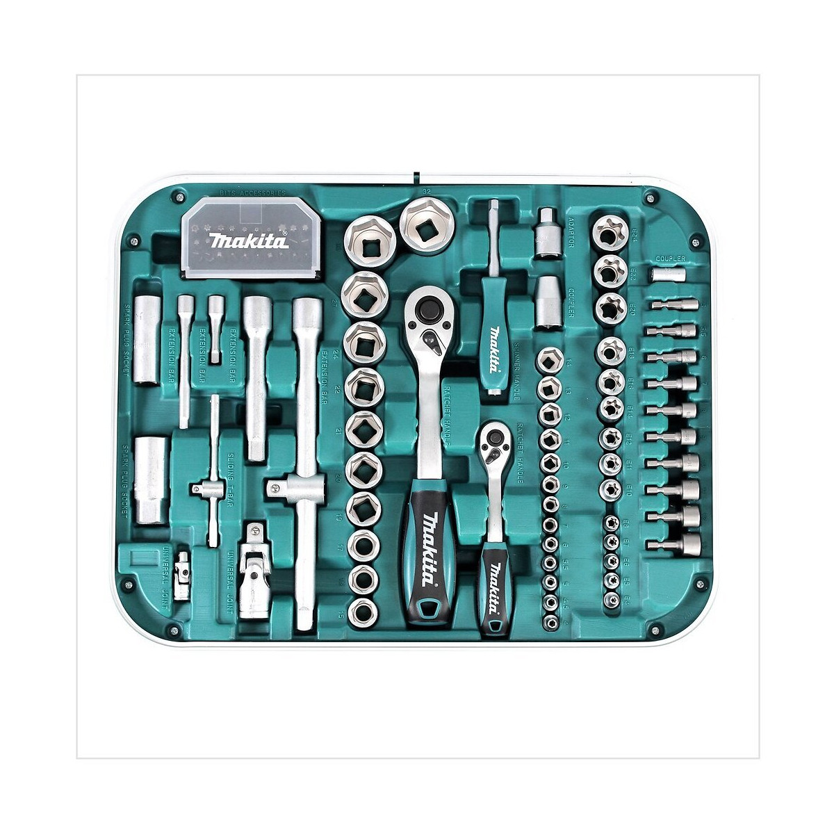Contenu du paquet: - 1x Makita Set d'outils de 227 Pièces avec Mallette de transport Description du produit: Le set d'outils Makita de 227 pièces comporte également des embouts, cliquets et clés. Les 227 pièces sont de fabrication Makita pour une utilisation de longue durée. Le set est livré dans une mallette de transport robuste et verrouillable avec renfort en aluminium. Spécifications techniques: - 80-assortiment d'embouts 1/4" (25mm): PZ, PH, TX, TX-R, Hx, Embouts spéciaux - 29-tassortiment d'embouts 5/16" (30 mm): PZ, PH, TX, TX-R - 30-assortiment d'embouts avec boîtier (25 mm): PZ, PH, TX, TX-R, Hx - 3x Adaptateur d'embouts - 1x Outil HEX pliante 8 Clés - 13x d'outils 1/4" de 4 à14 mm Hexagonale - 11x d'outils 1/2" de 15 à 32 mm Hexagonale - 10x d'outils 1/4" de 5 à 13 mm Hexagonale - 3x d'outils 1/2" de 20 à 24 mm Extérieur torx - 6x d'outils 3/8" de 10 à 18 mm Extérieur torx - 5x d'outils 1/4" de 4 à 8 mm Extérieur torx - 12x Clé Allen Acier Cr-V (8-19mm) - 2x Carré d'extension 1/2" - 2x Carré d'extension 1/4" - 2x Clé à bougie d'allumage 16 mm/ 21 mm 209!!! - 1x Tournevis avec support magnétique - 1x Tourelle carrée de 1/4 " - 1x Adaptateur 1/4 " carré sur 1/4" hexagonale - 1x Adaptateur 1/2" carré sur 3/8" hexagonale - 1x Adaptateur 1/2" carré sur 1/4" hexagonale - 1x Clés à cliquet 1/4" - 1x Clés à cliquet 1/2" - 1x Cardan 1/4" - 1x Cardan 1/2" - 1x Adaptateur pour extension 1/2 " - 1x Poignée transversale coulissante pour 1/4 " - 1x Mallette de transport - 2x Clé pour Mallette