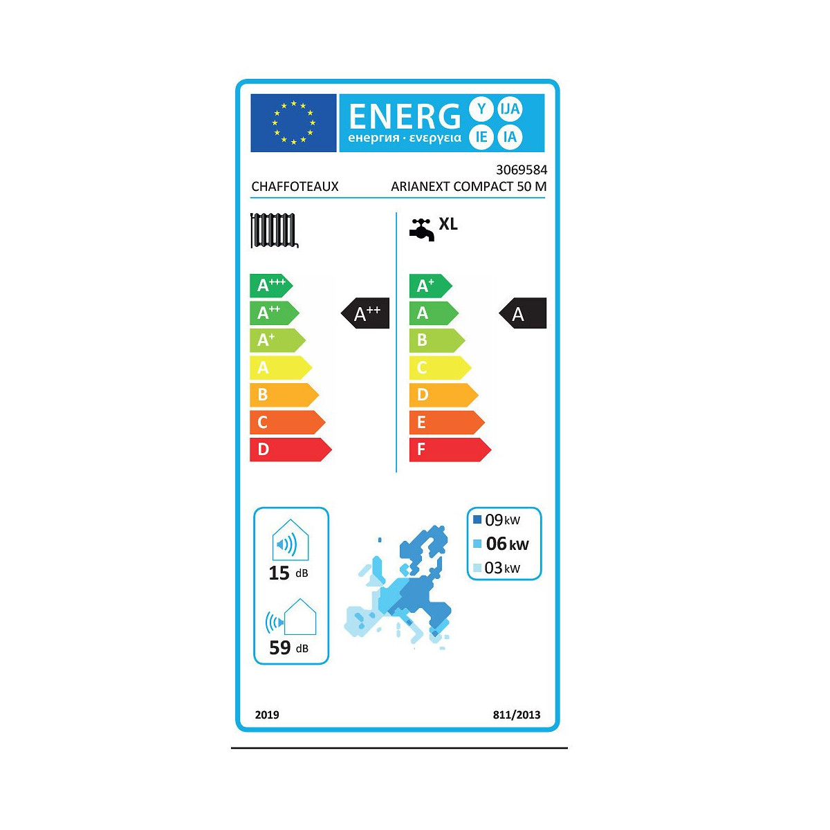 Arianext Plus M bénéficie d’un excellent maintien de la puissance même à basse température, elle peut fonctionner par tout temps et ce jusqu’à -20°C. Arianext Plus M à une production de chauffage jusqu'à 60°C Avec le choix de la PAC monobloc, l’installation est rapide et simple, sans manipulation de fluide frigorifique lors de sa mise en fonction. L'intervention d'un technicien sur la PAC Arianext Plus M peut se faire facilement avec l'accessibilité par l'avant de l'appareil. Intégration de la connectivité pour un pilotage à distance grâce à la solution ChaffoLink (livré de série avec l'expert Control et la passerelle WIFI Link) Caractéristiques générales Arianext Compact M 50 M Classe énergétique A+++ COP à 35°C 5,02 Puissance calorifique nominale -7/35°C 5,00 kW ETAS à 35°C 176 % Plage de fonctionnement chauffage - Air -20 / +35 °C Puissance acoustique à l'extérieur 57 dB(A) Puissance acoustique à l'intérieur 15 dB(A) Tension d'alimentation 230V Monophasé Intensité maximale 11 A Puissance de l'appoint électrique 5 kW Charge en fluide Frigorigène R 410 A 1,88 kg Poids à vide module extérieur 63 kg Poids à vide module intérieur 117 kg Dimensions module extérieur (HxLxP) 756 x 1016 x 374 mm Dimensions module intérieure (HxLxP) 1700 x 600 x 608 mm Pour la Garantie 2 ans Fabricant n'oubliez pas: La mise en service doit être effectuée par une station technique agrée par la marque