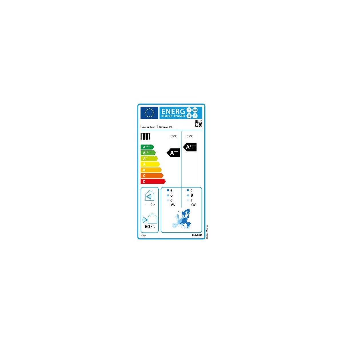 Pompe à chaleur Air / Eau monobloc avec appoint électrique Genia Air Saunier Duval Monobloc : Consisté d'un seul bloc pour l'unité intérieure et extérieure Une installation de chauffage simplifiée Installation simple et rapide, sans manipulation de fluide frigorigène ne nécessitant aucune qualification frigorifique Circuit chargé, scellé et testé en usine Adaptée à tous les types de circuits de chauffage standard (plancher chauffant, ventilo-convecteurs et radiateurs) La performance en toutes circonstance COP jusqu'à 7,6 Fonctionnement jusqu'à -20°C Une solution durable Sollicitation réduite du compresseur pour une plus grande longévité de fonctionnement Matériaux traités pour résister à la corrosion pour une résistance à l'usure renforcée Produit fabriqué en France Caractéristiques générales Genia Air 8 kW Classe énergétique A+++ Puissance calorifique nominale 7,6 kW Puissance rafraîchissement 7,3 kW Fluide frigorigène chargé R410A Charge en fluide frigorigène 1,95 kg Alimentation électrique 230 V / 50 Hz Intensité max de démarrage 20 A Protection électrique (disjoncteur conseillé) 16 A type C / D Section de câble recommandé 3 x 2,5 mm² Dimensions (HxLxP) 942 x 1103 x 415 mm Poids 106 kg Le module d'interface et le thermostat d'ambiance n'est pas compris avec ce produit
