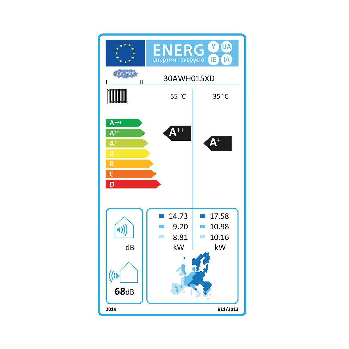 Inverter Type 30 AWH, la pompe à chaleur monobloc pour chauffage seul Ils offrent d'excellentes valeurs d'efficacité énergétique, un fonctionnement exceptionnellement silencieux et une précision dans la gestion des différentes températures qu'elles peuvent gérer.Gestion électronique du système : plusieurs capteurs placés dans des positions clés dans le circuit de réfrigérant détectent l'état de fonctionnement du système La technologie avancée utilisée donne aux utilisateurs des niveaux de confort optimisés, en ce qui concerne la régulation de la température de l'eau et le faible niveau sonore Fonctionnement possible à de faibles températures ambiantes en mode refroidissement (de 0 °C à 46 °C de température extérieure) Logiciel Positive Defrost. Cette logique de régulation avancée permet l'extraction d'énergie de l'air extérieur afin de faire fondre le givre sur la batterie à l'aide de ventilateurs lorsque le compresseur est à l'arrêt Réfrigérant R-410A respectueux de la couche d'ozone, très dense, quantité nécessaire réduite par rapport aux autres réfrigérants Très efficace, il permet d'obtenir un rapport d'efficacité énergétique (EER) élevé Habillage résistant à la corrosion Vendu avec Kit Hydraulique.Pour faire fonctionner votre AquaSnap 30 AWH, le Thermostat programmable 33AW-CS1 Carrier est obligatoire. Classe énergétique A++ COP 3,02 Puissance calorifique nominale -7/35°C 15 kW Plage de fonctionnement chauffage - Air -20 / +35 °C Puissance acoustique à l'extérieur 68 dB(A) Tension d'alimentation 230V Monophasé Intensité maximale 22,6 A Charge en fluide Frigorigène R 410 A 3,38 kg Poids à vide module extérieur 106 kg Dimensions module extérieur (HxLxP) 1363 x 908 x 350 mm Pour la Garantie 2 ans Fabricant n'oubliez pas: La mise en service doit être effectuée par une station technique agrée par la marque