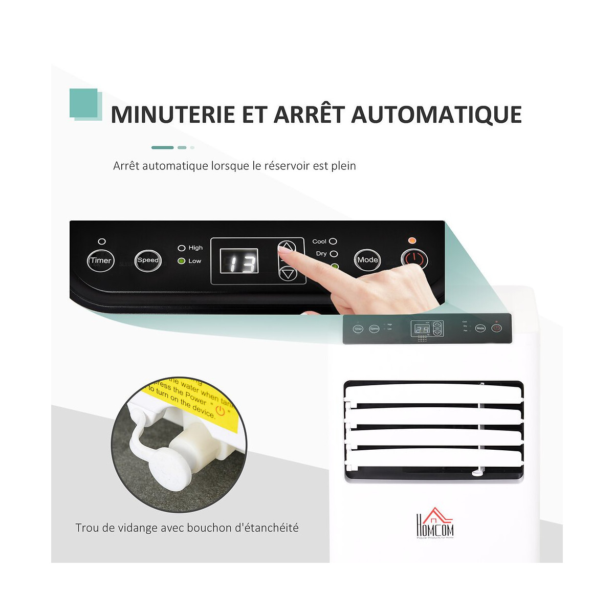 Caractéristiques : - Climatiseur ventilateur déshumidificateur portable 3 en 1 idéal pour utilisation dans la pièce intérieure de votre choix - Fonctions ventilateur (2 ventilateurs à vitesse réglable) et déshumidificateur complémentaires et très pratique au quotidien pour optimiser votre aération, votre taux d'humidité (séchage accru de vos vêtements) - Appareil mobile et compact sur 4 roulettes vous permettant de l'installer même dans les petits espaces - Grande efficacité : capacité de refroidissement de 8.000 BTU/h atteignant un débit d'air max. de 300 m³/h vous permettra de rapidement faire baisser votre température ambiante intérieure - Usage sain, écologique : réfrigérant naturel durable R290 (exempt de toxines et substances nocives) vous permettra de l'utiliser à long terme sans effet négatif sur votre environnement - Utilisation intuitive d'une grande simplicité : à distance par télécommande ou par action sur le panneau de contrôle (affichage LED de la température) - Système de mise en arrêt automatique de sécurité dès réservoir d'eau plein - Fonction minuterie de 24H max. idéale pour programmer son utilisation pendant votre absence, votre nuit, etc... - Nombreux accessoires fournis : tuyau d'évacuation d'air, filtre à poussière, réservoir d'eau Spécifications : - Couleur : blanc - Matériau principal : plastique ABS - Dim. totales : 30,5L x 32,8l x 67,8H cm - Puissance : 860 W - Capacité de couv. max. en toute efficacité : 15 m² - Capacité de refroid. max. : 8000 Btu - Tension d'entrée : 220-240 V, fréquence : 50 Hz - Réfrigérant : R290 - Débit d'air : 300 m³/h; - Déshumidification : 19,2 L/jr - Emission sonore : inf. à 54dB(A) - EEER : Niveau A (>2,6) - Télécommande : 2 piles AAA (non inclus) - Normes CE-EMC, LVD, RoHS, Erp, GS et Reach - Réf. : 823-003V92
