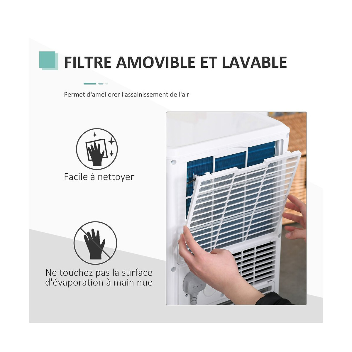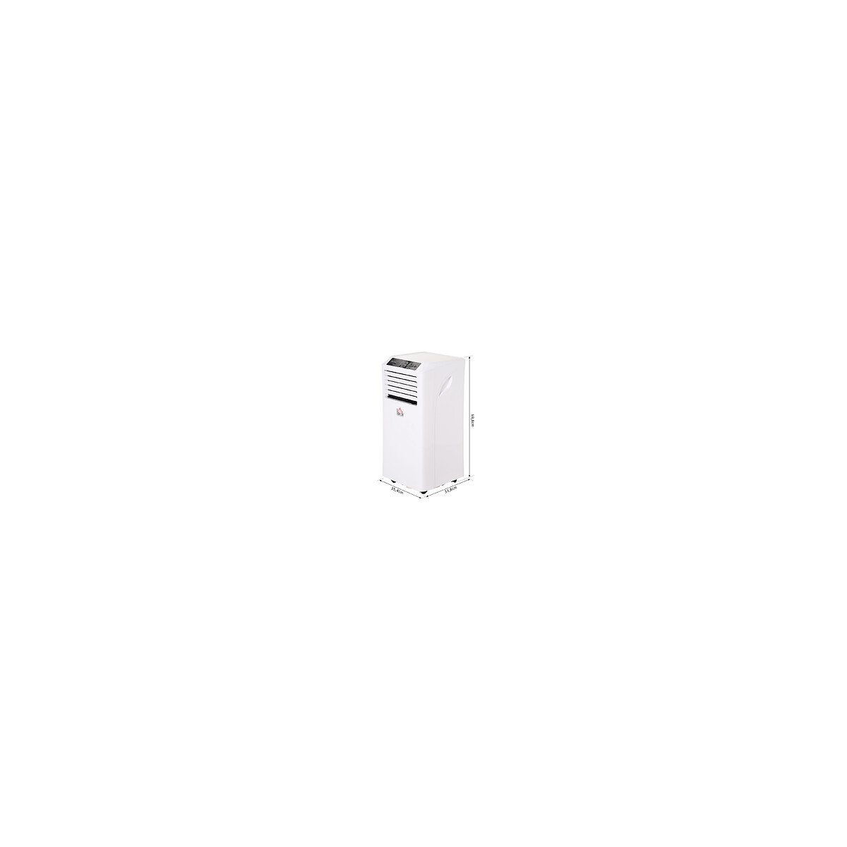 Caractéristiques : - Climatiseur ventilateur déshumidificateur portable 3 en 1 idéal pour utilisation dans la pièce intérieure de votre choix - Fonctions ventilateur (2 ventilateurs à vitesse réglable) et déshumidificateur complémentaires et très pratique au quotidien pour optimiser votre aération, votre taux d'humidité (séchage accru de vos vêtements) - Appareil mobile et compact sur 4 roulettes vous permettant de l'installer même dans les petits espaces - Grande efficacité : capacité de refroidissement de 9.000 BTU/h atteignant un débit d'air max. de 360 m³/h vous permettra de rapidement faire baisser votre température ambiante intérieure - Usage sain, écologique : réfrigérant naturel durable R290 (exempt de toxines et substances nocives) vous permettra de l'utiliser à long terme sans effet négatif sur votre environnement - Utilisation intuitive d'une grande simplicité : à distance par télécommande ou par action sur le panneau de contrôle (affichage LCD de la température) - Système de mise en arrêt automatique de sécurité dès réservoir d'eau plein - Fonction minuterie de 24H max. idéale pour programmer son utilisation pendant votre absence, votre nuit, etc... - Nombreux accessoires fournis : tuyau d'évacuation d'air, filtre à poussière, réservoir d'eau, etc... Spécifications : - Couleur : blanc - Matériau principal : plastique ABS - Dim. totales : 35,4L x 33,8l x 69,8H cm - Capacité de couv. max. en toute efficacité : 18 m² - Capacité de refroid. max. : 9000 Btu - Débit d'air max. : 360 m³/h - Puissance : 557 W - Tension d'entrée : 220-240 V, fréquence : 50 Hz - Réfrigérant naturel : R290 - Déshumidification : 24 L/jr - Emission sonore : inf. à 65dB(A) - EER : Niveau A (>2,6) - Télécommande : 2 piles AAA (non inclus) - Normes CE-EMC, LVD, RoHS, Erp, GS et Reach - Livraison effectuée en un colis - Réf. : 823-002V90