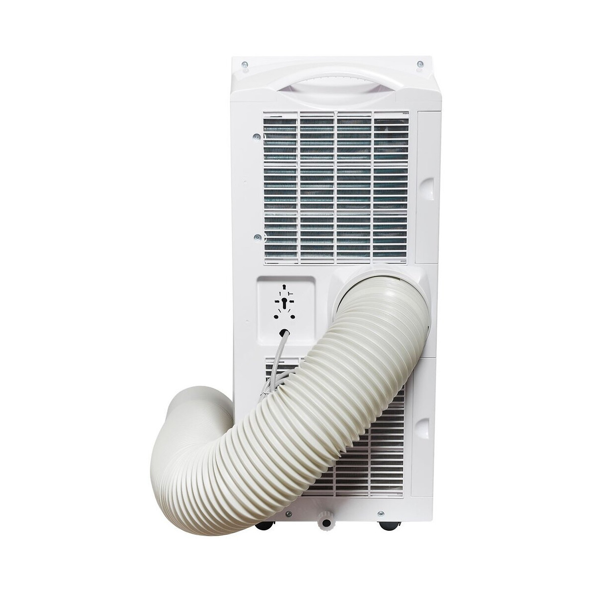 aac9000 - Le climatiseur mobile AAC9000 3 en 1 est idéal pour une surface d'environ 32m². - Climatiseur 3 en 1 : climatiseur, ventilateur et déshumidificateur Capacité de refroidissement : 9000 BTU / 2.6 kW Pour le rafraîchissement de pièces de jusqu'à 80 m3 soit environ 32m² Tuyau d'évacuation (1,5 m / 150 mm) Kit d'évacuation par la fenêtre inclus pour un attachement optimal Fonctionnement silencieux : 65 dB (A) Commande facile par un panneau numérique LED ou par la télécommande inclus Température réglable entre 16 °C et 31 °C Réfrigérant écologique: R290 Arrêt automatique avec minuteur (jusqu'à 24 heures) Mode sommeil pour un fonctionnement silencieux et économe en énergie Peut également être utilisé comme ventilateur (deux vitesses) Fonction pivotante Fonction déshumidification avec une capacité de 1 L/h Équipé de quatre filtres de purification d'air lavables Câble extra long d'environ 1.50 mètres Facile à déplacer grâce à 4 roues robustes 2 x piles AAA (non incluses) requises pour la télécommande Avec label de qualité certifié GS = normes de qualité et de sécurité très strictes Dimensions (L x l x H) : 32 x 38,5 x 73 cm. Poids : 23 kg.