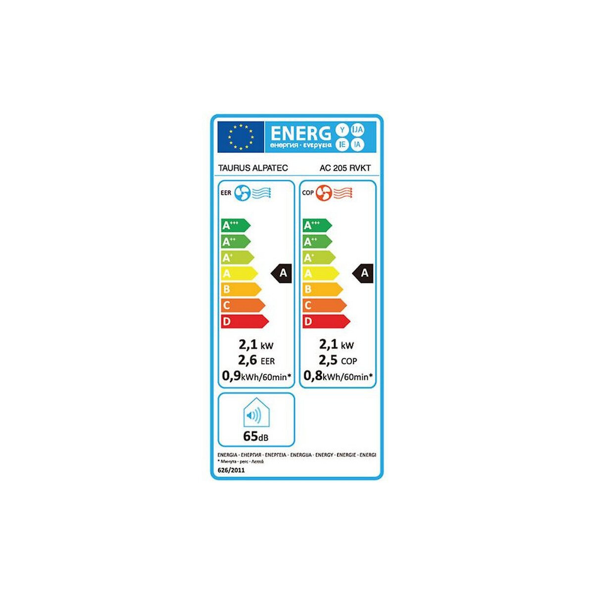 ac205rvkt-1 - Climatiseur mobile réversible AC205RVKT de Taurus Alpatec avec kit pour fenêtre coulissante ou volet roulant.Son mode réversible vous permettra de l'utiliser aussi l'hiver que l'été pour répondre au mieux à vos attentes - Puissance frigorifique : 1750 W - 6000 BTU/h Puissance calorifique : 2050 W - 7000 BTU/h Puissance sonore max : 65 dB(A) Surface traitée : 20 m² Débit d'air : 380 m3/h Puissance absorbée : 880 W Puissance absorbée (mode chaud) : 890 W Humidité supprimée (mode deshumidificateur) : 20 l/24h GAZ : R290 Minuteur 24h Mode nuit Fonction Ventilateur et déshumidificateur seule Large panneau de commande digital 2 vitesses de ventilation Dimension gaine : longeur : 1.5m / Diamètre : 150mm Télécommande, poignée de transport et roulettes Kit fenêtre: pour fenêtre coulissante ou volet roulant Dimensions produit (LxHxP) : 35 x 75 x 35 cm Poids net : 22 kg Couleur : Blanc