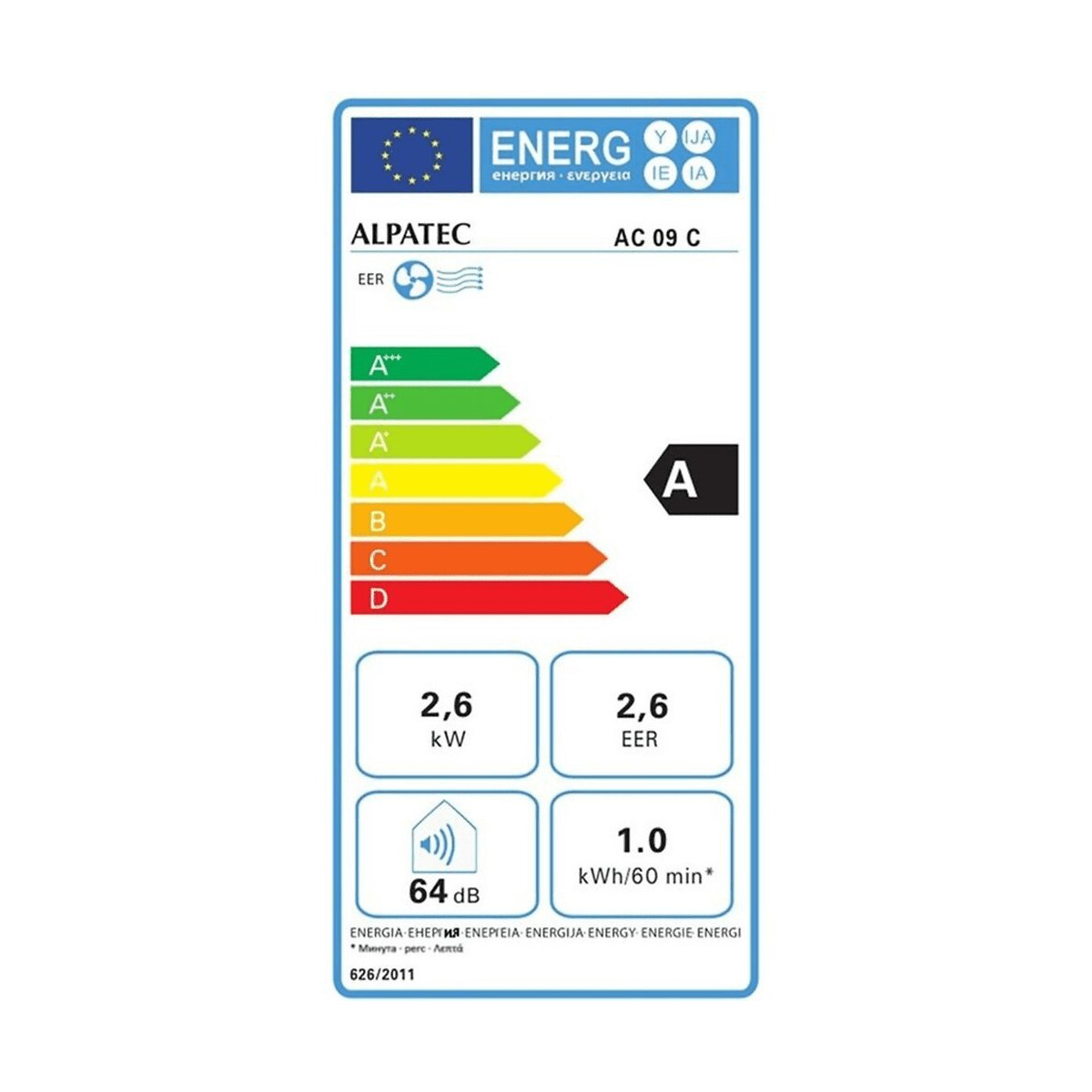 ac09c - Le climatiseur mobile AC09C d'ALPATEC possède un design compact avec une performance énergétique de haute qualité (Classe énergétique A). Idéal pour une pièce jusqu'à 20 m², de plus il est parfaitement mobile avec ses 4 roulettes qui lui permettent de se déplacer facilement. Système d'évacuation des eaux de condensat directement par la gaine d'air chaud. - Puissance de refroidissement: 2600 W Puissance absorbée 980 w Débit d'air : 320 m3/h Pour pièce jusqu'à 20 m² Niveau sonore très modéré : 64 dB Déshumidification : 28.8 litres par jour Fluide réfrigérant : R410A Classe énergétique A 3 modes de fonctionnement : climatisation ( de 16°C à 31°C), ventilation et déshumidification Minuteur 24h départ et/ou arrêt Large LED de contrôle 2 vitesses de ventilation Télécommande toutes fonctions Evacuation automatique des condensats Équipées de roulettes Dimensions : 33 x 68 x 28 cm Poids : 21 kg Couleur : Blanc