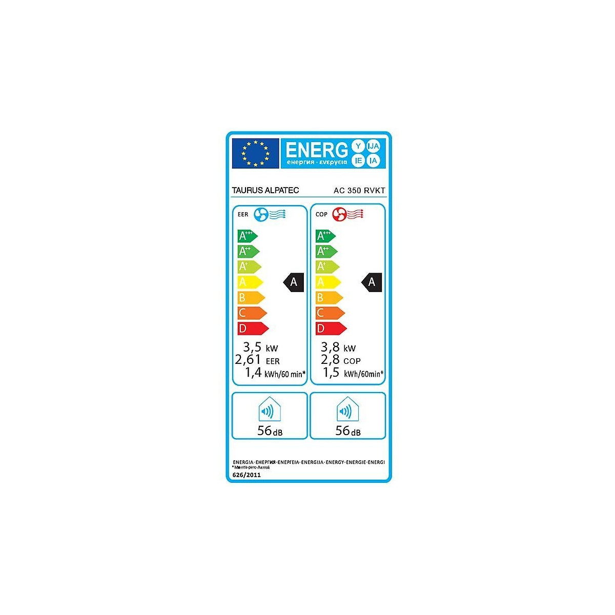 ac350rvkt-1 - Climatiseur mobile réversible 3500w 35m2 avec kit fenêtre taurus alpatec ac350rvkt. - Puissance frigorifique : 3500W / 12000BTU/h. Puissance calorifique : 3500W - 13000BTU/h. Pression sonore : 53 - 56dB(A). Puissance sonore maximale : 65dB(A). Classe énergétique : A. Surface traitée : 35m². Débit d'air : 435m3/h. Puissance absorbée : 1355 W. Puissance absorbée (mode chaud) : 1180 W. Humidité supprimée (mode déshumidificateur) : 33.61L / 24h. Large panneau de commande digital. 3 vitesses de ventilation. GAZ : R290. Minuteur : 24h. Fonction ventilateur et déshumidificateur seule. Télécommande, poignée de transport et roulettes. Kit fenêtre : pour fenêtre coulissante ou volet roulant. Kit fenêtre : F00005079 - dimensions 67.5 x 10 cm (max 133 cm) Dimensions gaine (l/Ø) : 1.5m / 15cm. Dimensions produit (LxHxP) : 46 x 83.5 x 33 cm. Poids net : 31.48 kg. Couleur : gris.