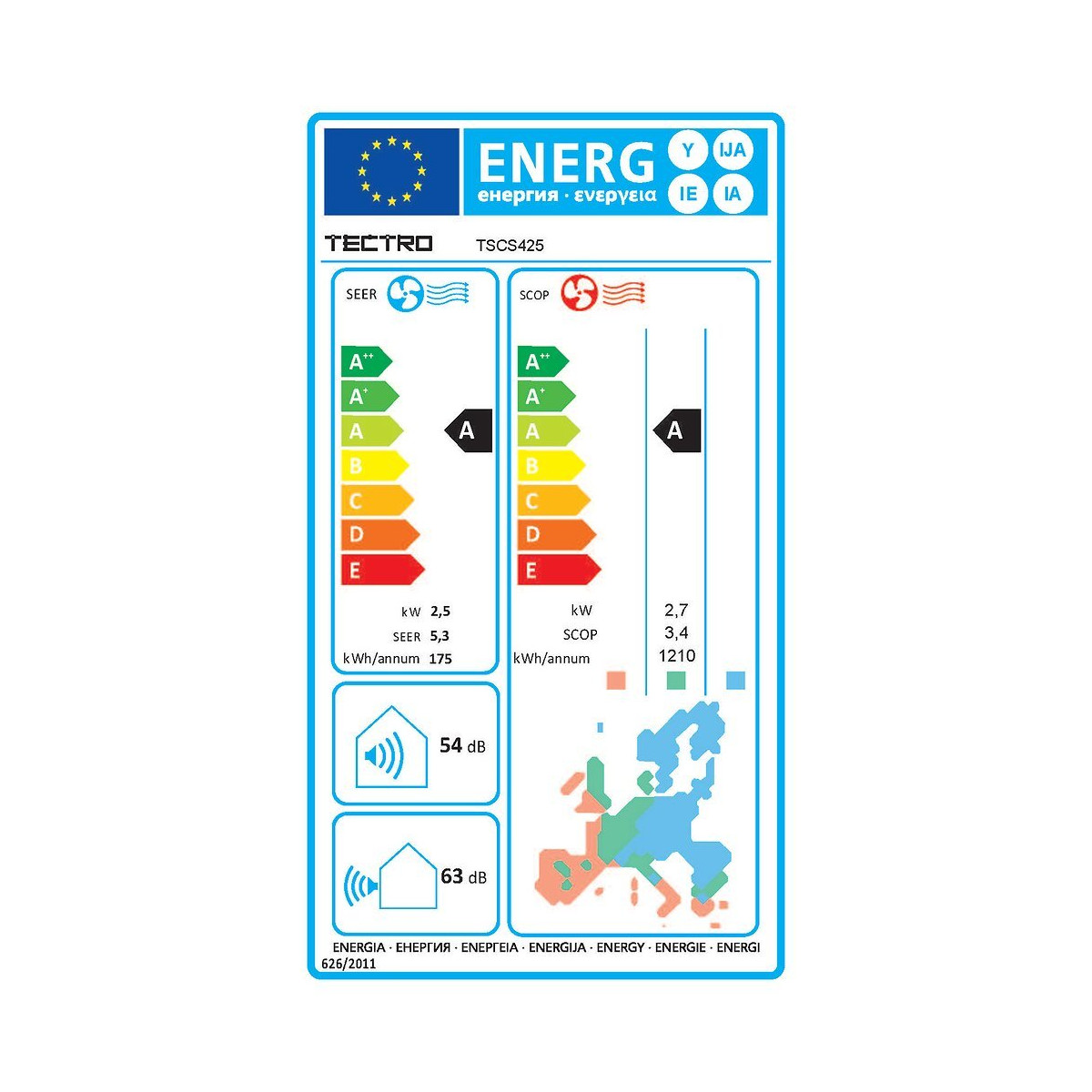 Le climatiseur fixe TECTRO 2,5 kw est équipé d'un système complet de traitement de l'air. Il peut refroidir, déshumidifier et chauffer l'air. Caractéristiques : Ecologique : le R410A est un réfrigérant HFC écologique et économique Programmateur: programmer la mise en route et/ou larrêt automatique de lappareil après une certaine durée Télécommande avec écran à cristaux liquides Volume de la pièce (m³) 60-85 Capacité de refroidissement min (W) 790 / max (W) 3280 Fonction chauffage min (W) 800 / (W) 3350 Classe d'efficacité énergétique refroidissement : A / Chauffage : A Capacité de déshumidification (L/h) 24 Consommation d'énergie mode refroidissement (kW) : 0,92 / chauffage : 0,92 Niveau sonore l'unité intérieure min (dB(A)) 30 / max (dB(A)) 41 Dimensions : Longueur 78 cm Largeur 25 cm Hauteur 54 cm Poids : 30 kg