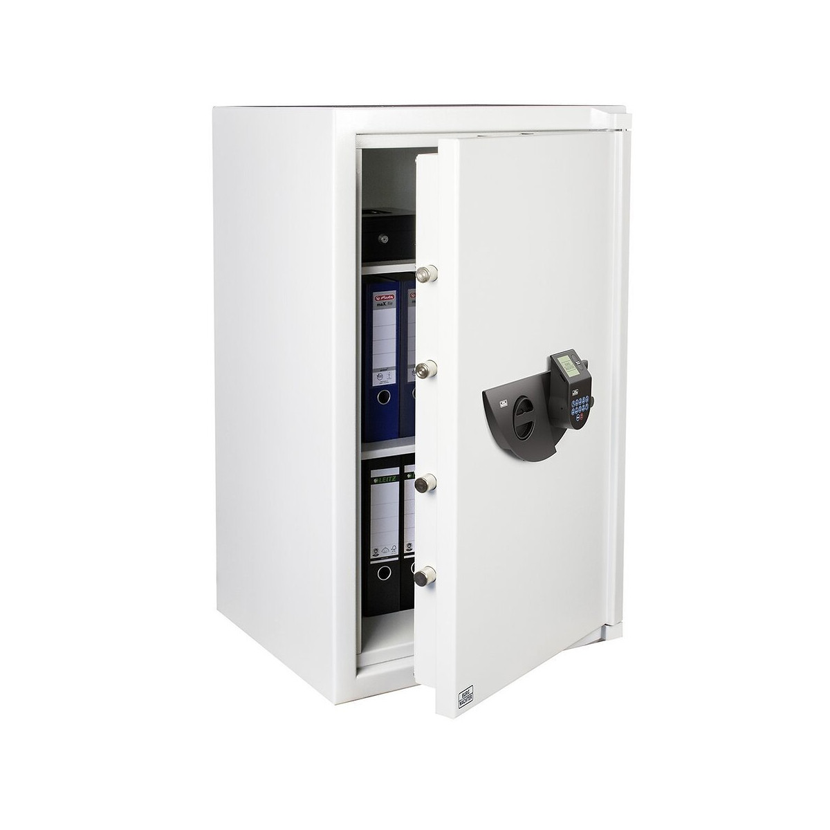 Coffre-fort pour documents, protection anti-effraction et anti-feu Degré de résistance II Deux niveaux de sécurité en un : Protection anti-effraction certifiée suivant EN 1143-1 et protection anti-feu certifiée suivant EN 1047-1 Protection anti-feu vérifiée suivant la classe de produit S 60 P (une heure de protection du papier contre le feu, test de la résistance à la chute compris) Corps à double-paroi, intégralement rempli avec un matériau ignifuge massif Corps avec une rainure anti feu sur tout le pourtour. Porte à double-paroi Verrouillage stable en 3 côtés par des pênes ronds de 28 mm servant de rail de maintient sur le côté charnière Equipé en série pour l’ancrage dans le sol, avec matériel de fixation fourni, et un trou percé au milieu du sol du coffre-fort Profondeur équivalente à un grand classeur, étagères réglables. Coffre-fort intérieur supplémentaire optionnellement Vernis en série en gris lumineux RAL 7035, le dispositif d’ouverture dénote en noir Votre plus sécurité : un système de verrouillage d’urgence double non réinitialisable dans la mécanique de porte Couleur : gris clair (RAL 7035) Certifié ECB•S (catégorie B) Reconnaissance de doigt vivant “Fake Finger Detection” Jusqu’à 10 codes utilisateur à six chiffres Jusqu’à 20 empreintes digitales Electronique moderne avec écran graphique et clavier tactile (éclairé) Interface disposée en pente pour une ergonomie optimale Temps de latence d’ouverture réglable (max. 99 min.) Possibilité de consulter l’historique Menu en 12 langues Changement des piles simple (piles fournies) Dimensions Extérieures ( H x L x P en mm) : 1096 x 641 x 555 Dimensions Intérieures ( H x L x P en mm) : 964 x 498 x 336 Ouverture du Porte (H x L en mm) : 946 x 498 Poids en kg: 450 Volume en L:158,3Spécifications techniques