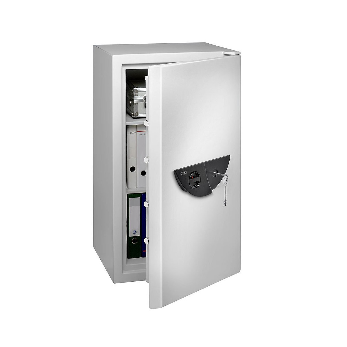 Coffre-fort pour documents, protection anti-effraction et anti-feu Degré de résistance II Deux niveaux de sécurité en un : Protection anti-effraction certifiée suivant EN 1143-1 et protection anti-feu certifiée suivant EN 1047-1 Protection anti-feu vérifiée suivant la classe de produit S 60 P (une heure de protection du papier contre le feu, test de la résistance à la chute compris) Corps à double-paroi, intégralement rempli avec un matériau ignifuge massif Corps avec une rainure anti feu sur tout le pourtour. Porte à double-paroi Verrouillage stable en 3 côtés par des pênes ronds de 28 mm servant de rail de maintient sur le côté charnière Equipé en série pour l’ancrage dans le sol, avec matériel de fixation fourni, et un trou percé au milieu du sol du coffre-fort Profondeur équivalente à un grand classeur, étagères réglables. Coffre-fort intérieur supplémentaire optionnellement Vernis en série en gris lumineux RAL 7035, le dispositif d’ouverture dénote en noir Votre plus sécurité : un système de verrouillage d’urgence double non réinitialisable dans la mécanique de porte Couleur : gris clair (RAL 7035) Serrure de haute sécurité blindé à double panneton Contrôlé VdS, catégorie 2 Certification ECB-S EN 1300, catégorie B 10 pistons de serrures, système de clé prisonnière 50 millions de fermetures En cas de clé perdue : immédiatement réglable sur une nouvelle fermeture ! Le dispositif de serrure dépasse de 25 mm du corps Dimensions Extérieures ( H x L x P en mm) : 1096 x 641 x 555 Dimensions Intérieures ( H x L x P en mm) : 964 x 498 x 336 Ouverture du Porte (H x L en mm) : 946 x 498 Poids en kg: 450 Volume en L:158,3Spécifications techniques