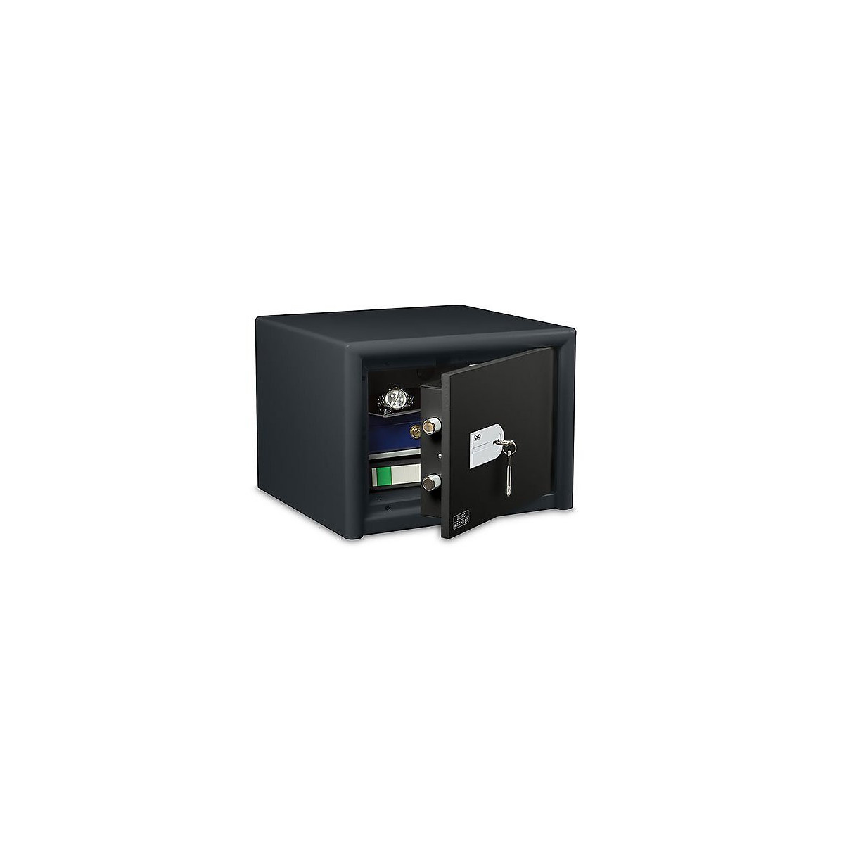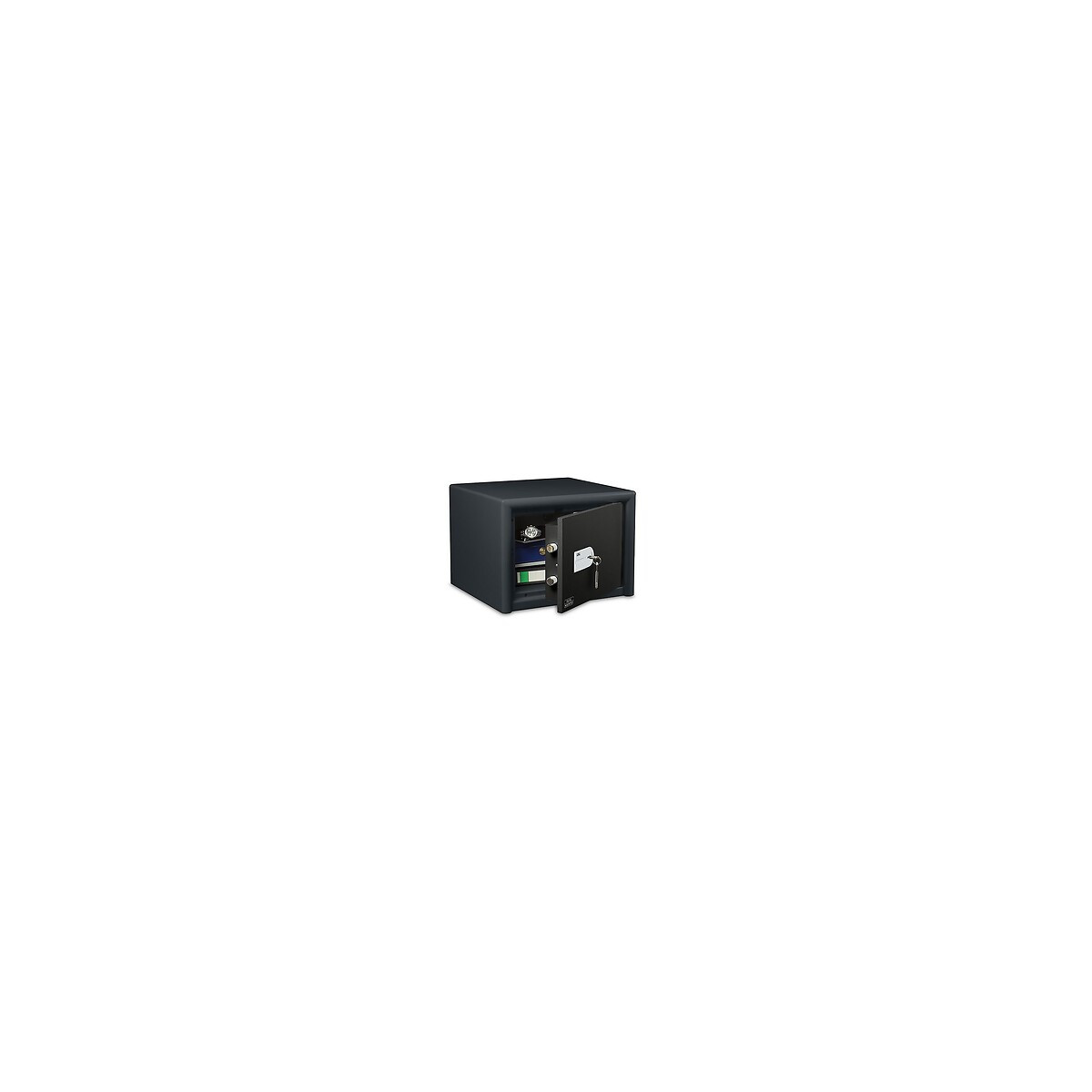 Sécurité vérifiée et surveillée par l’ECB-S / le VdS Résistance au feu LFS 30P selon EN 15659 Matériau ignifuge selon DIN 4102 Isolation composite au niveau de la plaque de porte pour protéger serrure et mécanisme de verrouillage de la chaleur Niveau de sécurité S2 selon DIN EN 14450 Niveau de sécurité B selon VDMA 24992, en l’état de mai 1995 Structure à double paroi Charnière incluses à l’intérieur du corps Verrouillage de côté par des goujons ronds épais de 25 mm & loquet sur le dessus Rail de maintient du côté charnière dela porte Possibilité d’ancrage dans le mur ou au sol, respectivement deux trous disposés en diagonal dans la paroi arrière et le sol du coffre-fort, matériel de fixation inclu Fabriqué en série avec une étagère de séparation Couleur : noir Serrure de sécurité blindée SecuSafe à double panneton : fabrication usine avec deux clés 9 gâchettes et un million de fermetures différentes contrôlé par le VdS et certification ECB-S Dimensions Extérieures ( H x L x P en mm) : 360 x 495 x 445 Dimensions Intérieures ( H x L x P en mm) : 245 x 380 x 297 Ouverture du Porte (H x L en mm) : 245 x 325 Poids en kg: 55 Volume en L: 27Spécifications techniques