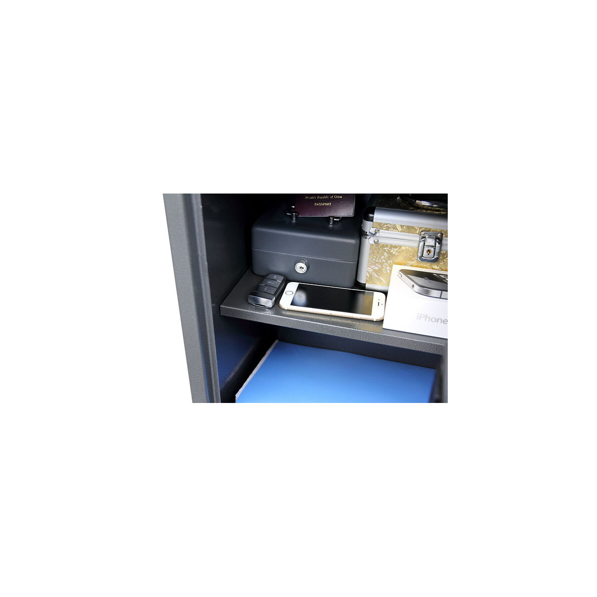 Phoenix Vela Maison et Bureau SS0804K Taille 4 Coffre de sécurité avec serrure à clef PROTECTION SECURITE Recommandé pour une valeur assurable de €1,000 d'argent liquide et €10,000 d'objets de valeur.* VERROUILLAGE: Le SS0800K est équipé d'une serrure à clef de haute sécurité et est fourni avec deux clefs. CONSTRUCTION: Les coffres Vela sont fournis avec deux pênes de verrouillage et des charnières intérieures cachées pour une sécurité supplémentaire. FIXATION: Prêt pour une fixation au mur ou au sol, avec boulonneries fournies pour murs en brique ou sols en ciment. COULEUR/FINITION: Finition par une peinture de haute qualité anti rayure de couleur graphite métallisée. Valeur assurable (Argent liquide / Objet de valeur):€1,000.00 / €10,000.00 Garantie:1 an Capacité:51 Litres Couleur:Graphite Métalique Construction:Porte en acier de 4 mm d'épaisseur avec corps en acier de 1,5 mm d'épaisseur Dimensions Extérieures ( HXLXP):500x350x310 mm Dimensions Intérieures ( HXLXP):495x345x300 mm Boulons de verrouillage live:2 Verrouillage:Clef Poids:16 kg Quantité de boulons:2 Etagères:1 étagère fixe Fixation:Mur et solSpécifications techniques