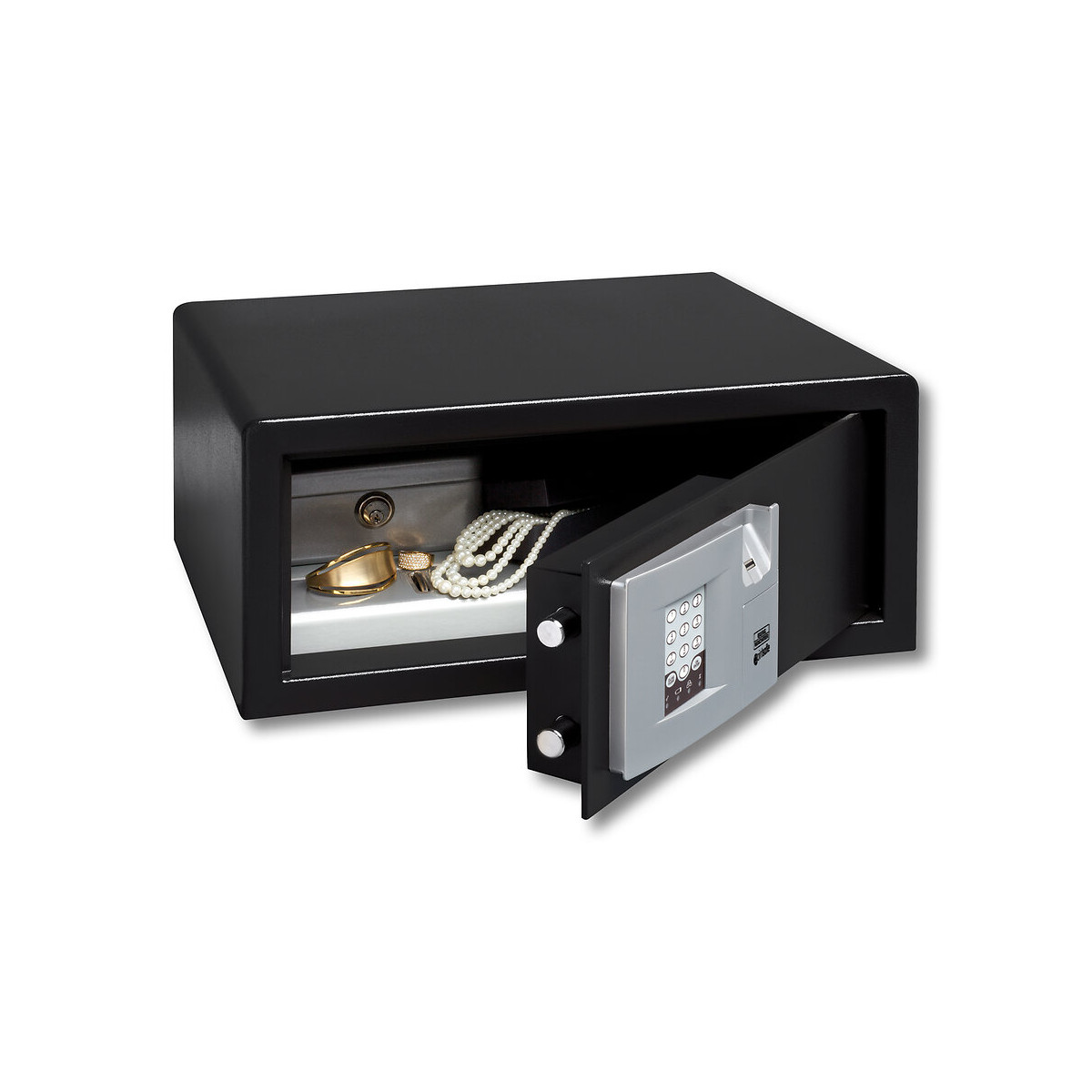 Le coffre-fort à ordinateur portable « Point » de BURG-WÄCHTER conserve votre équipement mobile en toute sécurité. L’intérieur est suffisamment spacieux pour accueillir votre ordinateur portable mais aussi vos documents importants et vos classeurs. Son corps résistant à paroi unique et son design compact conviennent parfaitement pour un montage mural à toute épreuve. Ce coffre-fort peut être intégré sans problème dans votre armoire ou votre bureau à l’aide du matériel de fixation. Technologie de lecture d’empreintes digitales : pratique et simple La serrure à code électronique dispose d’une technologie de lecture d’empreintes digitales et d’un code général et d’utilisateur programmables. Elle est ainsi une solution ergonomique et très sure. Vous pouvez modifier à tout moment la combinaison ainsi que les empreintes digitales. Son utilisation est confortable grâce à son verrouillage motorisé avec ouverture de porte automatique. La serrure électronique fonctionne avec des piles ce qui permet d’éviter un raccordement au secteur. Utilisez sans attendre le coffre-fort à ordinateur portable « Point » grâce aux 4 piles comprises dans la livraison. Il dispose également d’une serrure supplémentaire pour l’ouverture d’urgence si jamais vous avez besoin d’accéder rapidement à votre ordinateur portable. Veuillez noter que l’armature de la serrure dépasse de 10 mm. Dimensions Extérieures ( H x L x P en mm) : 200 x 445 x 380 Dimensions Intérieures ( H x L x P en mm) : 196 x 441 x 323 Ouverture du Porte (H x L en mm) : 140 x 380 Poids en kg: 15,2 Volume en L: 27,9Spécifications techniques