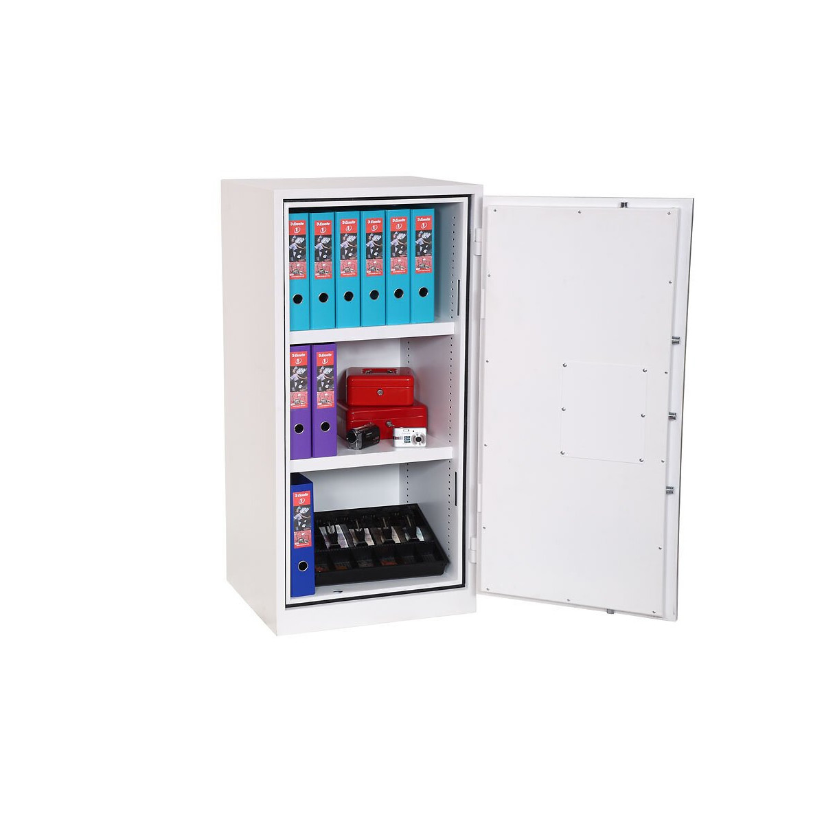 Phoenix Fire Ranger FS1511E Taille 1 Coffre ignifuge avec serrure électronique Le Phoenix Fire Ranger établit de nouvelles normes pour la protection contre les incendies et les cambriolages dans un format économique, pratique et attrayant. PROTECTION FEU (PAPIER): Offre 30 minutes de protection au feu pour documents papier jusqu'à 500°C. VERROUILLAGE: Equipé d’une serrure électronique d’utilisation facile R3 avec affichage LED clair. Afin de renforcer la sécurité, la serrure dispose également d’ un double contrôle, code caché et code brouillé. PROTECTION SECURITE: Valeur assurable recommandée €1,500 d'argent liquide ou €15,000 d'objets de valeur. CONSTRUCTION DE LA PORTE: Dispositif de verrouillage à espagnolette trois voies de haute sécurité donnant une grande force et résistance à toute attaque. AMÉNAGEMENT : Fourni avec 2 étagères réglables en hauteur qui comprend également des rails de suspension pour les dossiers latéraux en standard. COULEUR/FINITION: Finition par une peinture de haute qualité résistante aux rayures RAL9003 blanche. Valeur assurable (Argent liquide / Objet de valeur):€1,500.00 / €15,000.00 Protection au feu (Papier):30 Minutes Garantie:Garantie de 2 ans sur site contre les défauts de fabrication et la garantie de remplacement "après le feu". Garantie Incendie:Oui Capacité:230 Litres Couleur:Blanc Construction:Corps en acier à double paroi avec un intervalle coupe feu de 50 mm rempli de multicouche d'un matériau de barrière résistant au feu Dimensions Extérieures ( HXLXP):1225 mm x 600 mm x 520 mm Dimensions Intérieures ( HXLXP):1078 mm x 505 mm x 405 mm Boulons de verrouillage live:5 Verrouillage:Electronique Numéro RAL:RAL9003 Poids:77kg Quantité de boulons:Vide Etagères:2 étagères réglables Dossier à levier:Dossier Levier Arch - 18 Classeur Arch Foolscap à levier:Dossier Foolscap Lever Arch - 16 Boîte de rangement Foolscap:Fichier boîte Foolscap - 15Spécifications techniques
