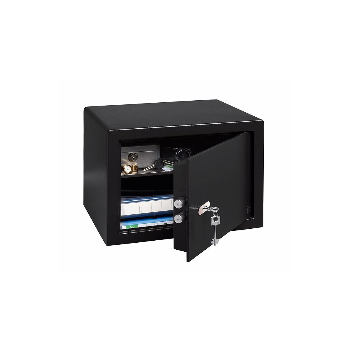 Les coffres-forts de la gamme PointSafe testés dans le laboratoire d’essais de BURG-WÄCHTER conviennent particulièrement bien pour une intégration dans des armoires, des bureaux ou sur des étagères. Il s’agit de coffres-forts compacts destinés à une utilisation privée. Le corps solide à une paroi et son poids modéré font du PointSafe le coffre-fort idéal pour une utilisation à domicile. Rangez-y en toute sécurité votre argent, vos bijoux ou dans les modèles plus spacieux vos documents et vos classeurs. Les modèles P 2, P 3 et P 4 disposent d’une étagère amovible. Les tailles P 3 et P 4 peuvent également accueillir des documents et des classeurs grâce à leur profondeur suffisante. La porte à double paroi ralentit une effraction rapide du coffre-fort. Grâce à ses quatre trous de fixation, deux à l’arrière et deux dans le fond, ce coffre-fort peut être ancré solidement au mur à l’aide du matériel de fixation. Ainsi, impossible d’emporter facilement votre coffre-fort. Le design simple et compact du PointSafe s’intègre à presque tous les meubles auxquels vous pouvez penser. Le modèle classique et traditionnel de serrure de coffre-fort. Afin de limiter les risques de vol, conservez la clé de la serrure à double panneton à un endroit sûr ou ayez-la toujours sur vous. Le PointSafe est équipé en usine de deux clés. Si vous perdez une clé, vous pouvez demander un double pour votre coffre-fort. Testé dans le laboratoire d’essais de BURG-WÄCHTER Corps solide à une paroi Porte à double paroi Conçus pour être fixé au mur et au sol, deux trous dans la paroi arrière et deux dans le fond, livré avec matériel de fixation Pour un montage dans une armoire, un bureau, etc. une étagère amovible Dimensions Extérieures ( H x L x P en mm) : 320 x 442 x 350 Dimensions Intérieures ( H x L x P en mm) : 310 x 435 x 288 Ouverture du Porte (H x L en mm) : 240 x 317 Poids en kg: 20 Volume en L: 38,8Spécifications techniques