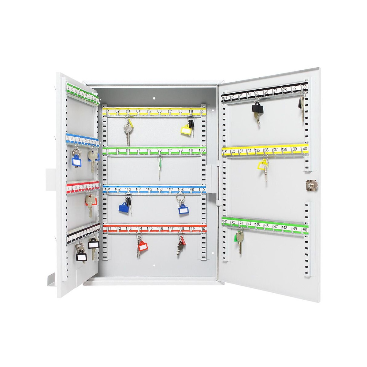 Serrure à cylindre, 2 clés Corps et porte en tôle de haute qualité, registre de clé pivotant une partition Poudre plastique enduite de gris clair 150 porte-clés inclus gratuitement. Les bandes de crochets sont numérotées et réglables dans le système de crochets destiné au montage mural 4 trous dans la paroi arrière Ø 5,5 mm Le matériel de montage est inclus Poids:9.2 kg Nombre de crochets:150 Dimensions extérieures mm (H x L x P) :550 x 380 x 140Spécifications techniques