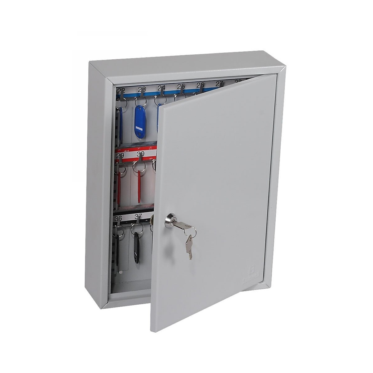Phoenix série KC 42 Crochets boîte à clés avec serrure à clef Une série de boîtes à clés de haute qualité avec serrure à clé allant de 42 à 600 crochets. VERROUILLAGE: Les armoires sont fabriquées avec une clé à cylindre de haute qualité fournie avec 2 clés. CARACTÉRISTIQUES SPÉCIALES: Chaque armoire est livrée avec des barres pour crochets réglables et des étiquettes numérotées. Les armoires de 400 et 600 crochets sont à double porte.. FIXATION: Les armoires ont des trous pré-percé pour une fixation au mur. FINITION: Finition par une poudre de peinture de haute qualité résistante. Garantie:1 an Capacité:42 touches Couleur:Gris clair Dimensions Extérieures ( HXLXP):350x270x80 mm Verrouillage:Clef Poids:4 kg Nombre de Crochets :42 clefs Fixation:MurSpécifications techniques