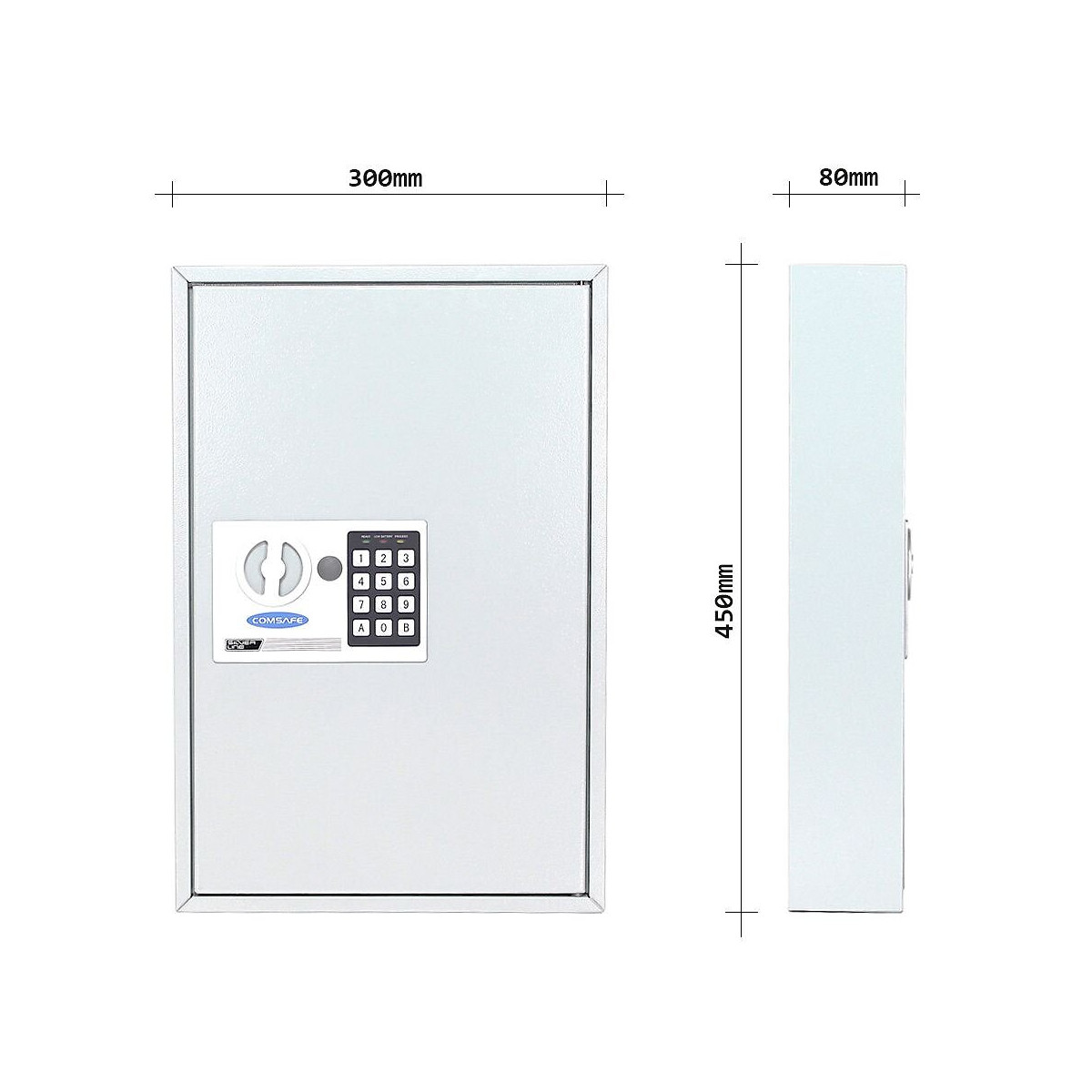 Serrure électronique moderne avec 100 millions d'options de réglage Clavier à membrane plat et non saillant avec info LED Fonctionnement sur piles avec 4 x AA 1,5 V (non inclus) Verrouillage et déverrouillage mécaniques économisant la batterie au moyen d'une poignée rotative si la batterie est faible, cela est indiqué par un affichage LED serrure mécanique d'ouverture d'urgence en boîtier SOS (pas de code maître) avec clé, double Corps et porte en tôle de haute qualité, Poudre de plastique enduite de gris clair 64 porte-clés inclus gratuitement. Les bandes de crochets sont numérotées et réglables dans le système de crochets destiné au montage mural 4 trous dans la paroi arrière Ø 5,5 mm Le matériel de montage est inclus Dimensions extérieures mm (H x L x P) :450 x 300 x 80 Poids : 4,2 Kg Nombre de crochets:64 clésSpécifications techniques