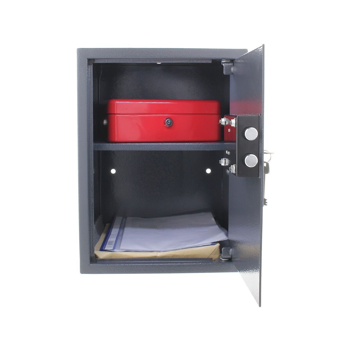 Acier de haute qualité Feuille de porte 3 mm Corps 1,5 mm Feu pli Charnières internes stables, angle d'ouverture 90 ° Verrouillage à 2 boulons robuste Serrure de sécurité à double panneton avec deux clés incl. Plier le bas Trous percés dans la paroi arrière et au sol Matériel d'ancrage inclus Dimensions extérieures: 415 x 310 x 350 mm Dimensions intérieures: 412 x 307 x 299 mm volume: 37,5 L Poids: 12 kgSpécifications techniques