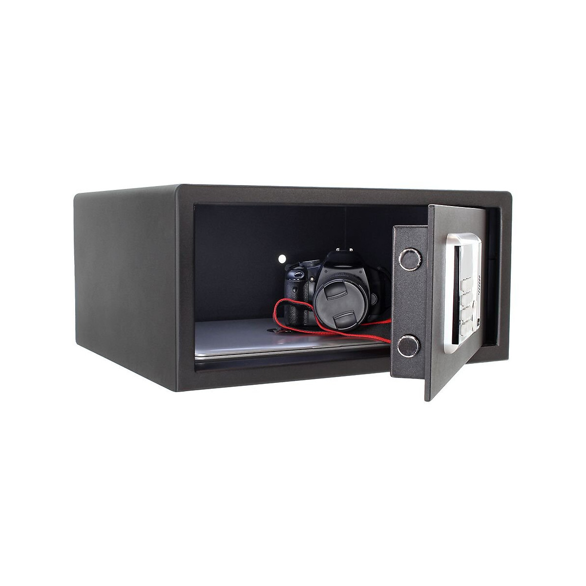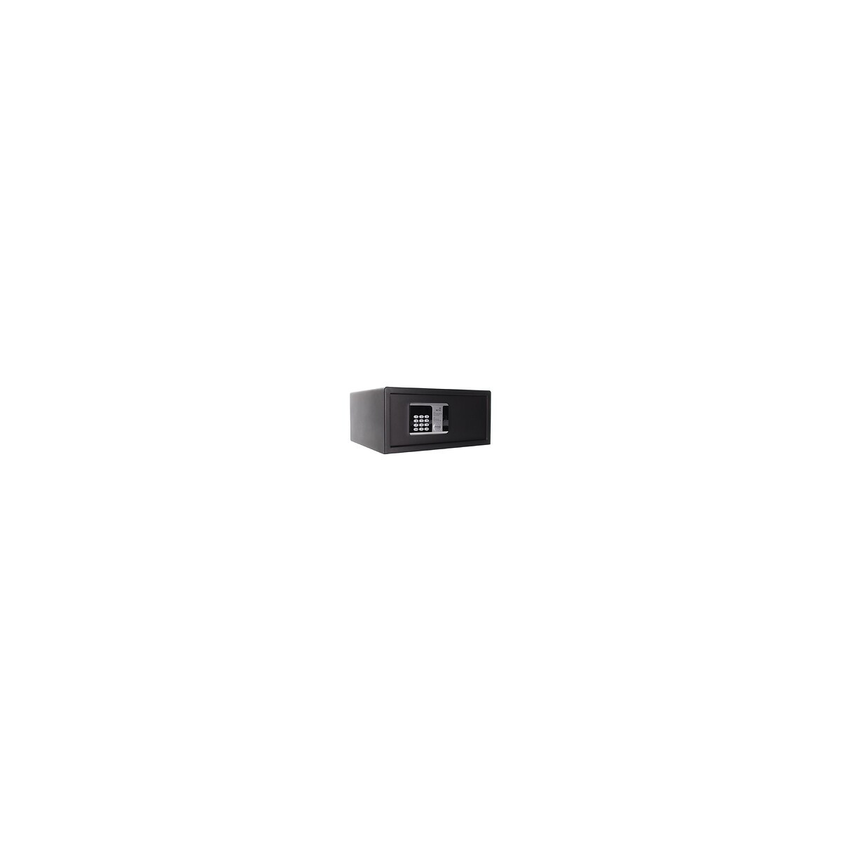 serrure électronique à piles (4 piles 1,5 V non incluses) peut être exploité avec n'importe quelle carte qui possède la technologie RFID (ATM, carte de crédit, carte d'hôtel...) ou code numérique ouverture d'urgence électronique par code maître ouverture mécanique d'urgence avec clé, double. verrouiller de la même manière Meubles de haute qualité coffre-fort pour hôtel ou pirvat corps simple paroi Épaisseur du corps : 2,5 mm Feuille de porte : 5 mm Eclairage intérieur (Led, côté charnières, s'allume pendant un certain temps) Feu pli charnières internes et stables Dimensions extérieures mm (H x L x P) :200 x 435 x 370 Dimensions intérieures mm (H x L x P ):195 x 430 x 310 Poids : 9.5 Kg Volume:26 litresSpécifications techniques