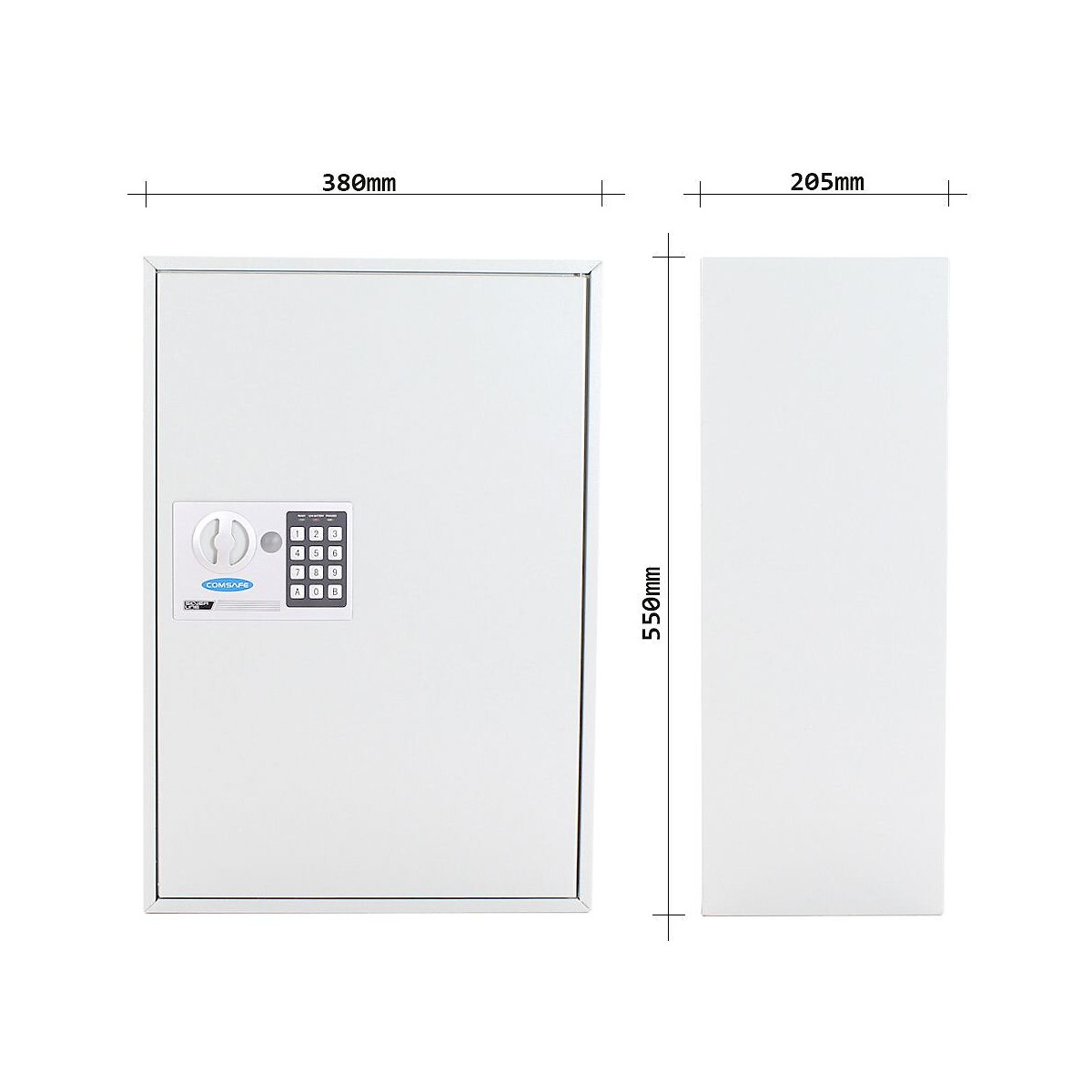 Serrure électronique moderne avec 100 millions de possibilités de réglage. Clavier à membrane plat et non saillant avec info LED Fonctionnement sur piles avec 4 x AA 1,5 V (non inclus) Verrouillage et déverrouillage mécaniques économisant la batterie au moyen d'une poignée rotative. Indication de batterie faible au moyen d'un affichage LED Serrure mécanique à ouverture d'urgence dans les boîtiers SOS. Pas de code maître, un code utilisateur rails à crochets réglables, deux cloisons Registre de clés, pivotant 300 porte-clés sont gratuits Dimensions extérieures mm (H x L x P) :550 x 380 x 205 Poids : 13.3 Kg Nombre de crochets:300 clésSpécifications techniques