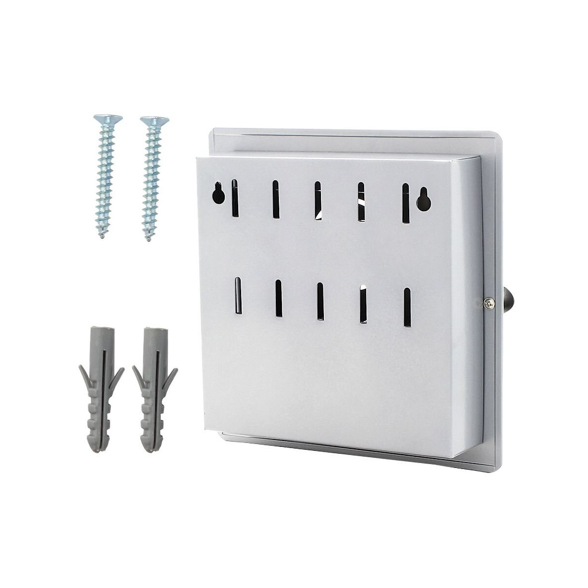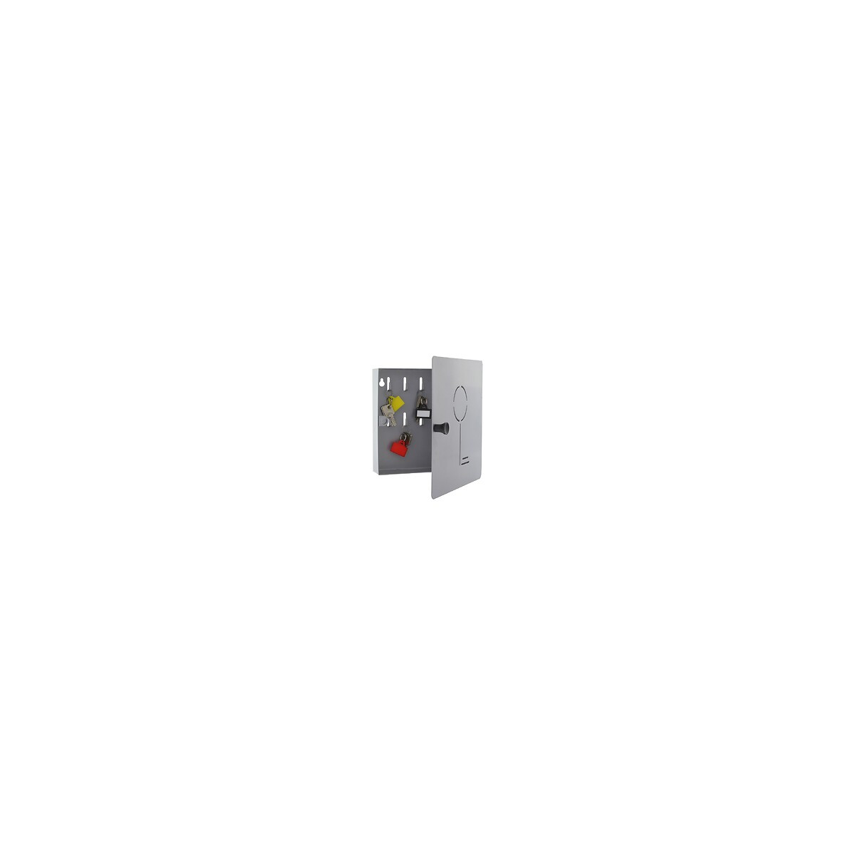 en tôle d'acier galvanisée argent clé décorative sur le devant, perforée 10 crochets à l'intérieur pour les clés Fermoir magnétique pour montage mural y compris le matériel de montage Dimensions extérieures: 220 x 220 x 50 mm Dimensions intérieures: 185 x 185 x 45 mm Poids: 0,7 kg Volume:2 litresSpécifications techniques