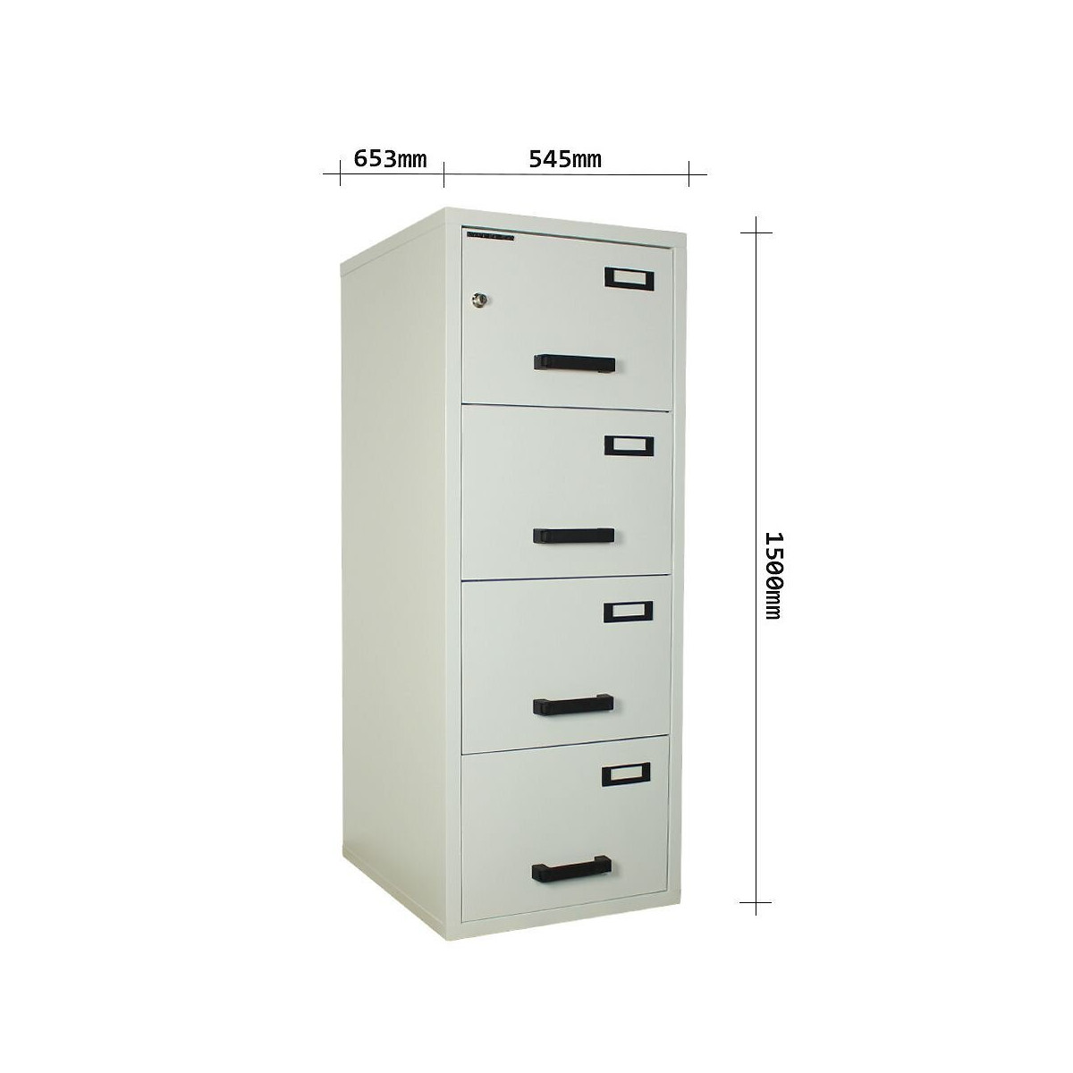 Résistance au feu : (60 minutes pour le papier) Serrure à cylindre de sécurité avec 2 clés Couvert de poudre résistant aux rayures quatre tiroirs entièrement extensibles Grande profondeur de tiroir Tiroirs adaptés aux documents A4 et documents de bureau Poignées métalliques plastifiées (SoftTouch) Option d'étiquetage sur chaque tiroir Les tiroirs peuvent être verrouillés individuellement avec une seule serrure Poignée encastrée en saillie non incluse avec la profondeur externe. Dimensions extérieures mm (H x L x P) :1500 x 545 x 653 Dimensions intérieures mm (H x L x P) :250 x 390 x 500 Poids : 210 Kg Volume:48,75 litresSpécifications techniques