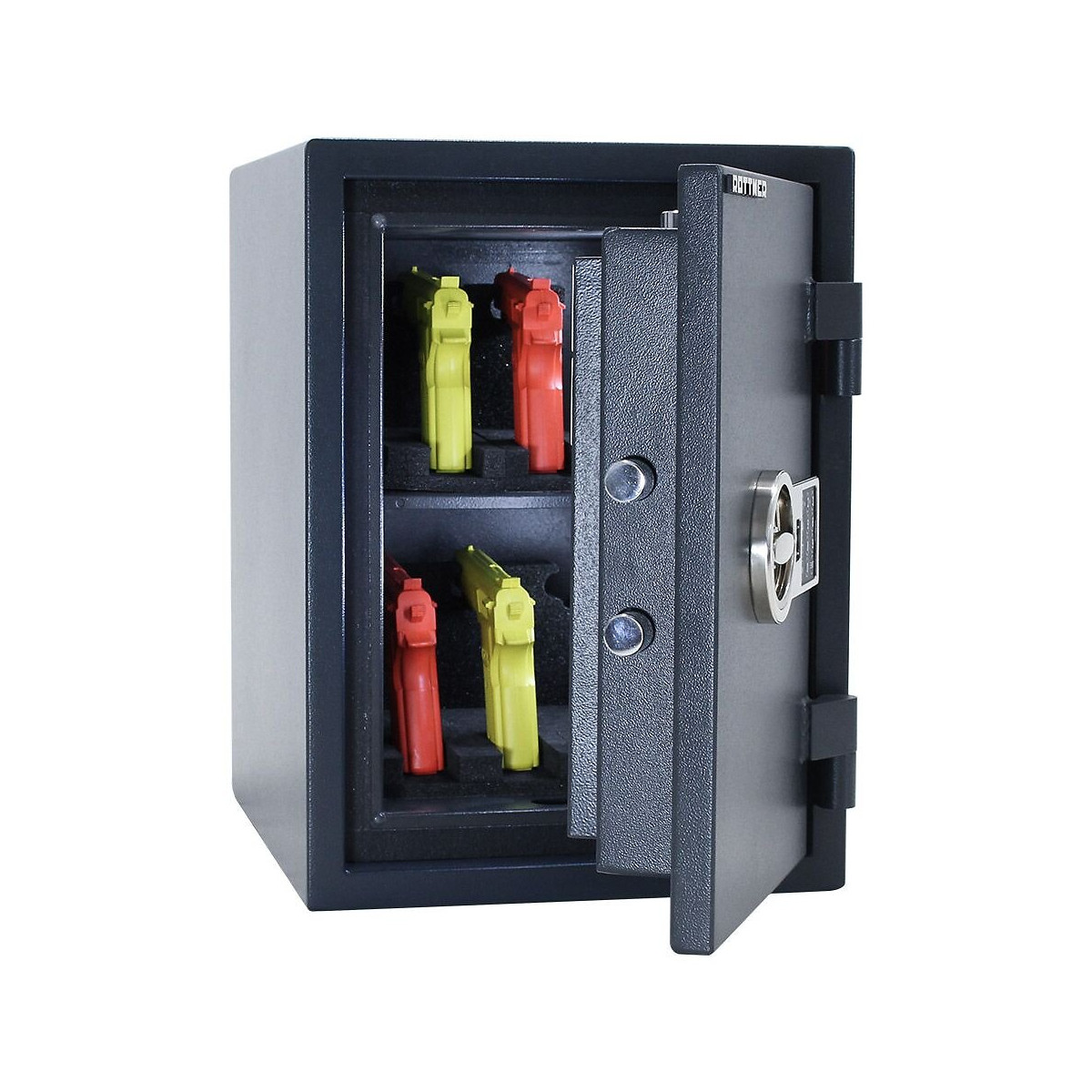 Classe 1 PN-EN 1143-1 : 2012 IMP 30min coupe-feu pour papier - LFS 30P selon EN 15659 BG Serrure électronique de sécurité EN 1300, classe A, sans révision 9 codes utilisateurs possibles Alimentation de secours avec batterie possible serrure anti-perçage corps à double paroi Épaisseur de la porte : 95 mm Épaisseur de paroi : 55 mm rempli de matériel spécial de protection contre l'incendie charnières externes Extension des dimensions extérieures par emboîtement 15 mm - charnières dépassant de 30 mm Fermeture à 3 côtés 4 boulons 1 étagère, réglable 3 dossiers peuvent être logés 2 trous en bas Matériel de fixation inclus dans la livraison Dimensions extérieures mm (H x L x P) :490 x 360 x 450 mm Dimensions intérieures mm (H x L x P) :360 x 249 x 300 mm Poids :66 Kg Volume:26 litresSpécifications techniques