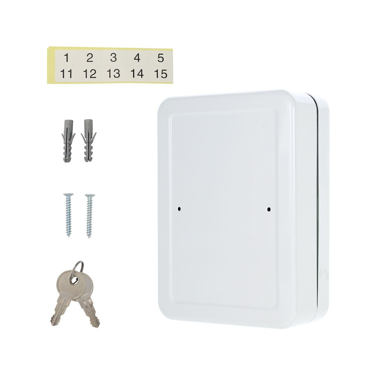 Boîtier et porte en tôle d'acier 1 partition 48 crochets fixes - non réglables 6 crochets sur chaque barre Les bandes de crochets sont numérotées consécutivement convient pour 48 bols Serrure à cylindre avec 2 clés destiné au montage mural 2 trous dans le mur du fond Matériel de fixation incl. Autocollants avec des chiffres pour la numérotation Dimensions extérieures mm (H x L x P) :250 x 185 x 85 Poids : 1,5 Kg Nombre de crochets:48 clésSpécifications techniques