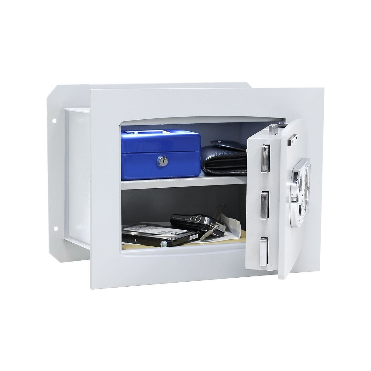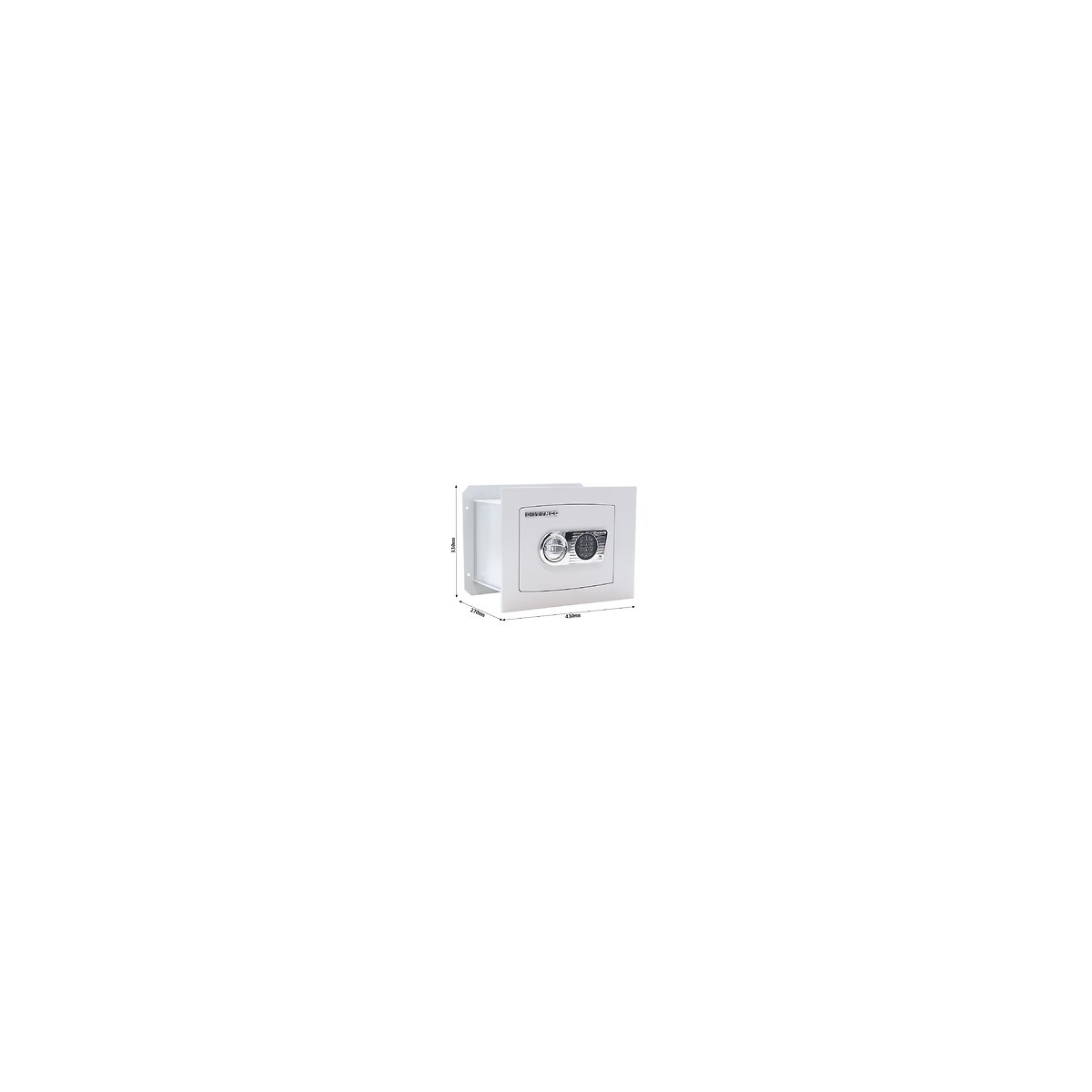 résistance à l'effraction testée - classe EN 1 porte à plusieurs parois Feuille de porte 10 mm Epaisseur de la porte 65 mm Verrouillage par boulon robuste à 3 côtés charnières cachées stables, ouverture de porte à 90 ° Le pli coupe-feu tout autour empêche la pénétration du feu et des gaz de combustion La porte se ferme avec 5 boulons la poignée tournante augmente la profondeur extérieure de 15 mm Serrure électronique EN 1300 classe B sans pile 9 volts peut être alimenté en courant de secours de l'extérieur Il s'agit d'un coffre-fort mural - veuillez noter les instructions d'installation ! Les instructions d'installation sont incluses! 4 trous dans la paroi arrière avec Ø 8 mm Dimensions extérieures mm (H x L x P) :330 x 430 x 270 Dimensions intérieures mm (H x L x P ):230 x 345 x 200 Poids : 28 Kg Volume:16 litresSpécifications techniques