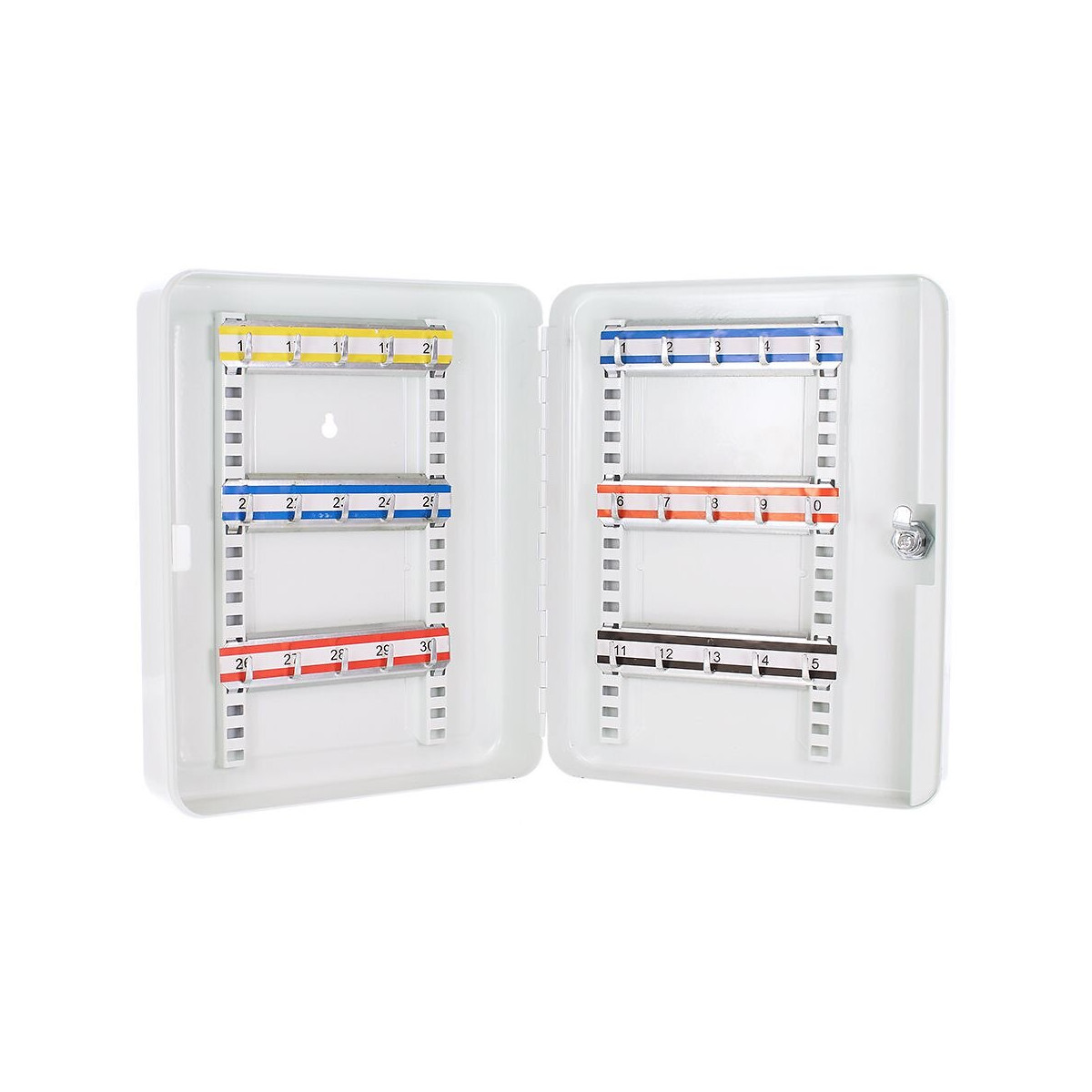 Boîtier et porte en tôle d'acier convient pour 30 clés 6 rails à crochets galvanisés brillants avec 5 crochets Bandes de crochet réglables dans le système de grille Crochets numérotés consécutivement de 1 à 30 étiquettes de bandes de couleurs différentes Serrure à cylindre avec 2 clés Destiné au montage mural Matériel de fixation incl. 2 trous dans le mur du fond Dimensions extérieures mm (H x L x P) :300 x 245 x 85 Poids : 2.1 KgSpécifications techniques
