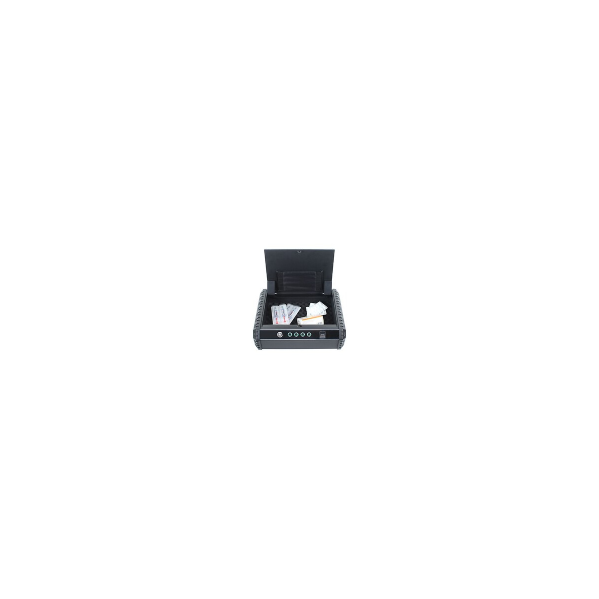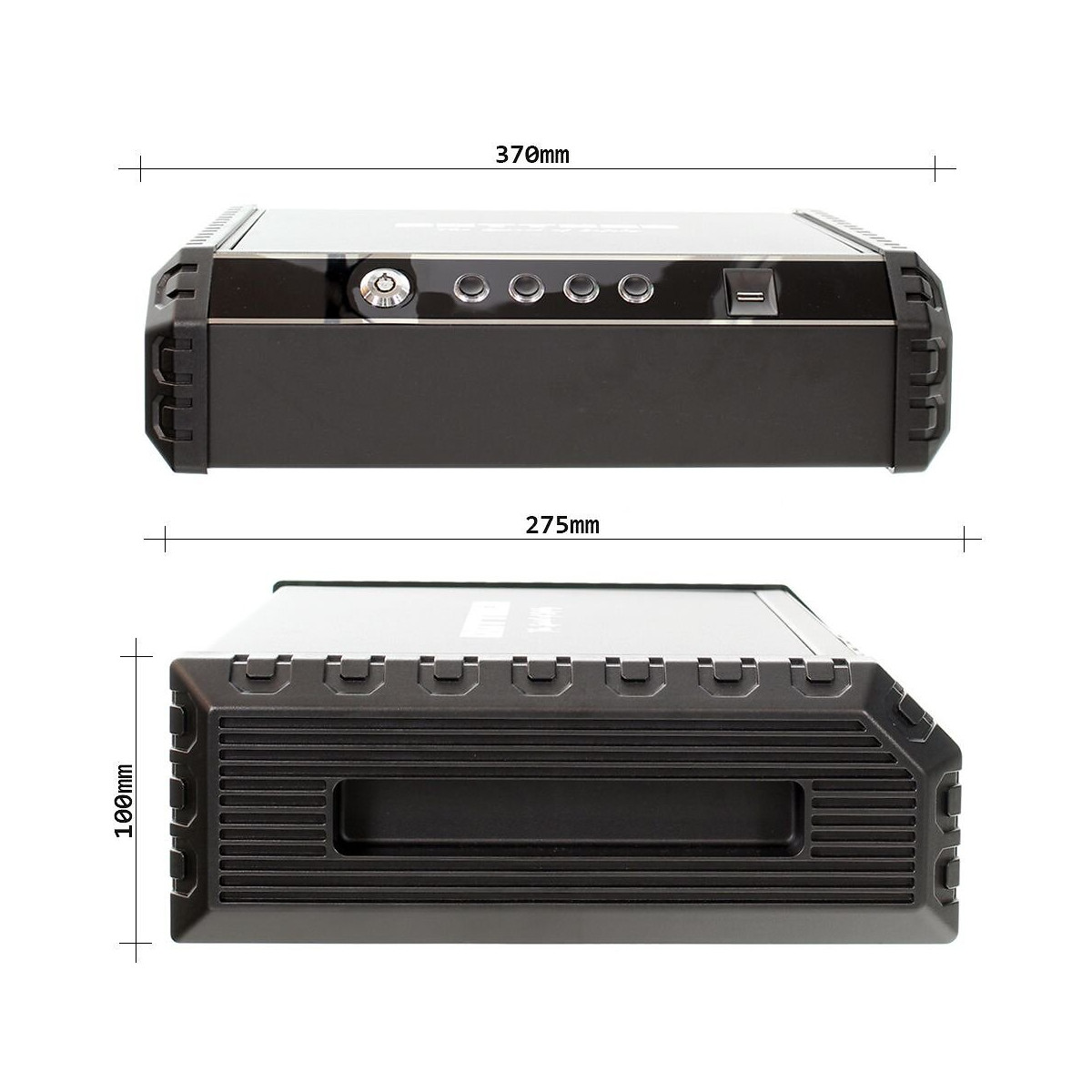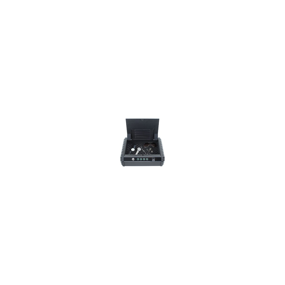 Accès rapide à l'aide d'un lecteur d'empreintes digitales biométrique jusqu'à 20 empreintes digitales peuvent être enregistrées au moyen d'un code programmé Ouverture de secours avec une clé, l'ouverture initiale se fait également avec une clé (2 clés incluses) Kit de montage inclus 2 trous en bas en acier Fonctionnement avec 4 piles alcalines AA (non incluses) éclairage des touches vertes Boîte à bijoux / boîte à bijoux Boîte de protection / cassette de protection Étui à pistolet - pour jusqu'à 2 armes de poing Mais aussi pour ranger des objets de valeur tels que passeports, chéquiers, petits appareils électroniques et argent Dimensions extérieures mm (H x L x P) :100 x 370 x 275 Dimensions intérieures mm (H x L x P ):90 x 300 x 200 Poids : 5.5 Kg Volume:5.4 litresSpécifications techniques
