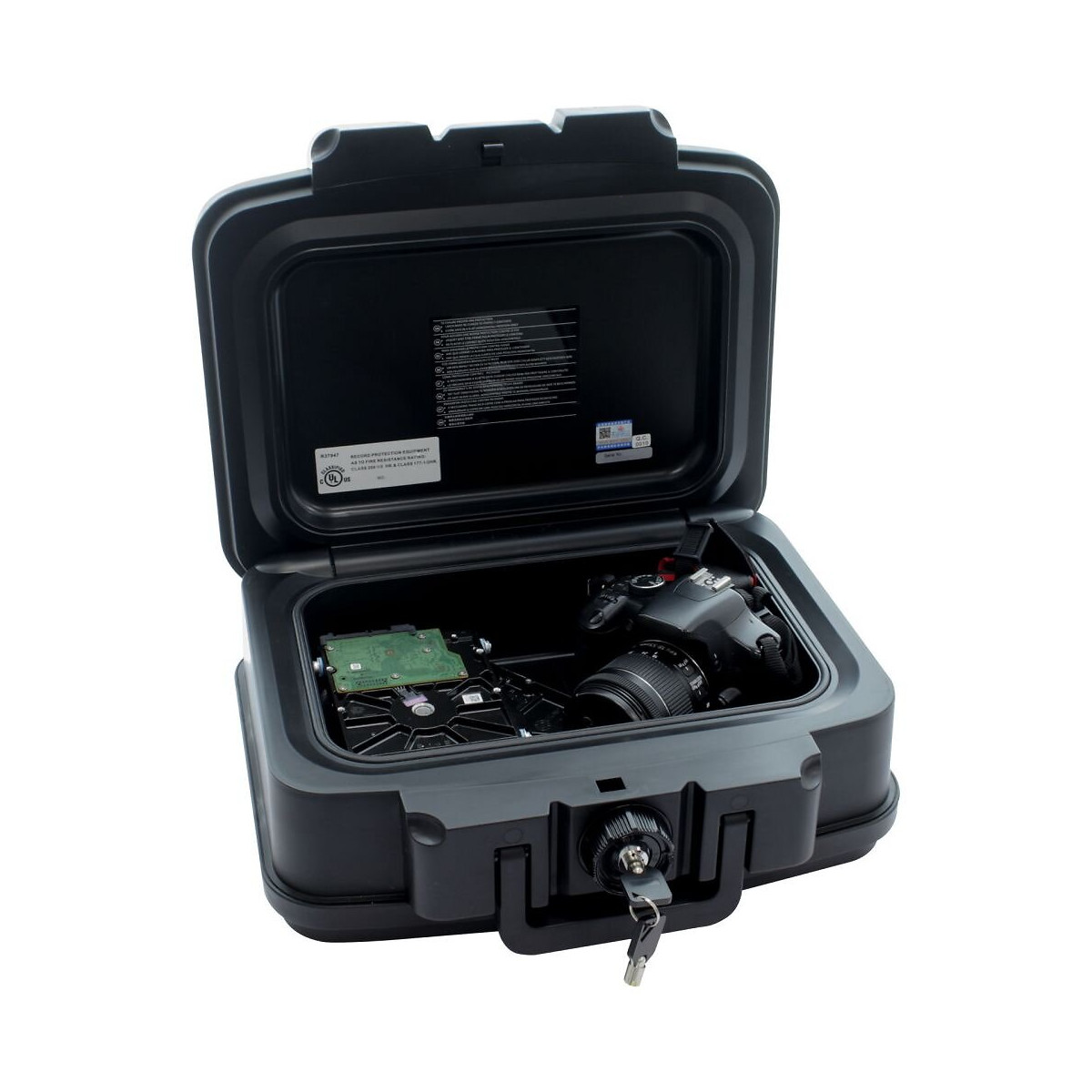 Serrure à cylindre avec 2 clés La solution optimale pour le stockage de documents et supports de données privés ou professionnels importants 30 min de protection incendie pour les documents et supports de données à 843 °C max. (test UL - la température interne reste inférieure à 177 °C) Résistant à l'eau poignée pratique Dimensions extérieures mm (H x L x P) :165 x 382 x 324 mm Dimensions intérieures en mm (HxLxP):94 x 290 x 183 mm Poids : 9 Kg Volume:5 litresSpécifications techniques