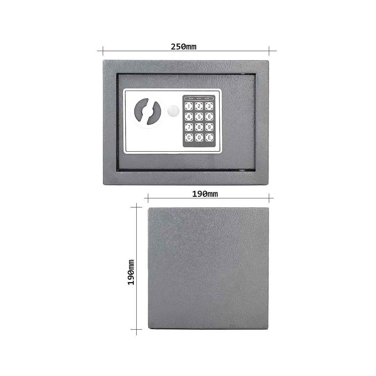 Serrure électronique avec 100 millions d'options de commutation (uniquement code utilisateur à 8 chiffres), sans affichage Fonctionnement sur piles avec 4 piles AA de 1,5 volts (non incluses) ouverture mécanique d'urgence possible, avec 2 clés clavier facile à lire 2 trous dans la paroi arrière avec Ø 8 mm 2 trous dans le fond avec Ø 8 mm Matériel de fixation inclus dans la livraison Coffre-fort pour meuble à simple paroi Acier de haute qualité Feuille de porte 3 mm Corps 1 mm Feu pli Charnières internes stables Angle d'ouverture de porte de 90 ° verrouillage à boulon fort, double Dimensions extérieures mm (H x L x P) :190 x 250 x 190 Dimensions intérieures mm (H x L x P ):185 x 245 x 140 Poids : 3.5 Kg Volume:6 litresSpécifications techniques