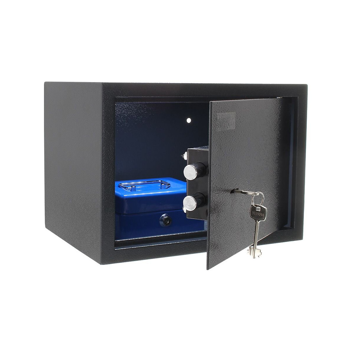 Coffre-fort pour meuble à simple paroi Acier de haute qualité Feuille de porte 3 mm Corps 1 mm Feu pli Charnières internes stables Angle d'ouverture de porte de 90 ° verrouillage à boulon fort, double Serrure de sécurité à double panneton avec 2 clés 4 trous dans la paroi arrière et 4 trous dans le fond avec Ø 8 mm Matériel d'ancrage inclus Dimensions extérieures mm (H x L x P) :250 x 350 x 250 Dimensions intérieures mm (H x L x P ):248 x 348 x 199 Poids : 5.5 Kg Volume:17 litresSpécifications techniques