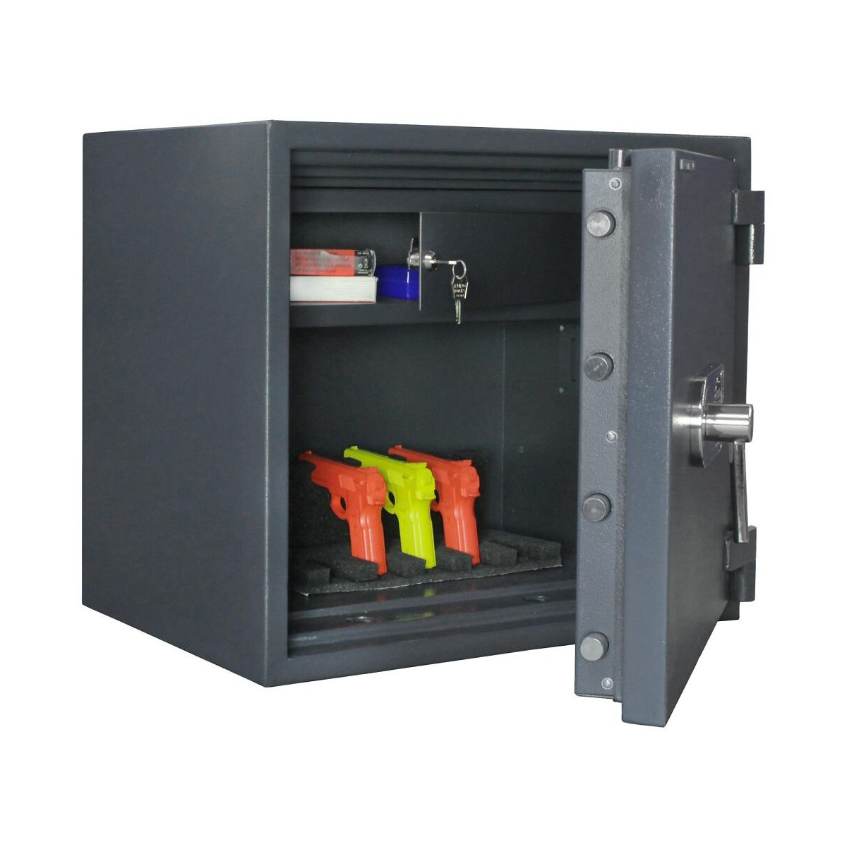 corps à double paroi Épaisseur de paroi 58 mm Épaisseur totale de la porte : 125 mm Verrouillage par boulon sur 3 côtés au moyen de 8 boulons Barre de préhension arrière côté charnières Serrure électronique de EN 1300 classe A. avec batterie bloc 9 volts Foret de verrouillage protégé 1 maître / 9 codes utilisateurs si le code est mal saisi 3 fois, le système est bloqué pendant 5 minutes Alimentation de secours une étagère un coffre intérieur comprenant 2 clés, amovible (vissé). Préparation EMA : plaque de montage dans le corps et la porte pour détecteurs sismiques, passage de câble flexible porte-corps, préparation pour contacteur de porte 1x entrée de câble dans la paroi arrière et 1 x chacune dans les parois latérales gauche et droite préparées et pré-percées - non percées un trou de fond percé, un trou de paroi arrière pré-percé Matériel de fixation inclus dans la livraison Dimensions extérieures mm (H x L x P) :610 x 680 x 510 Dimensions intérieures mm (H x L x P ):480 x 565 x 360 Poids : 305 Kg Volume:98 litresSpécifications techniques